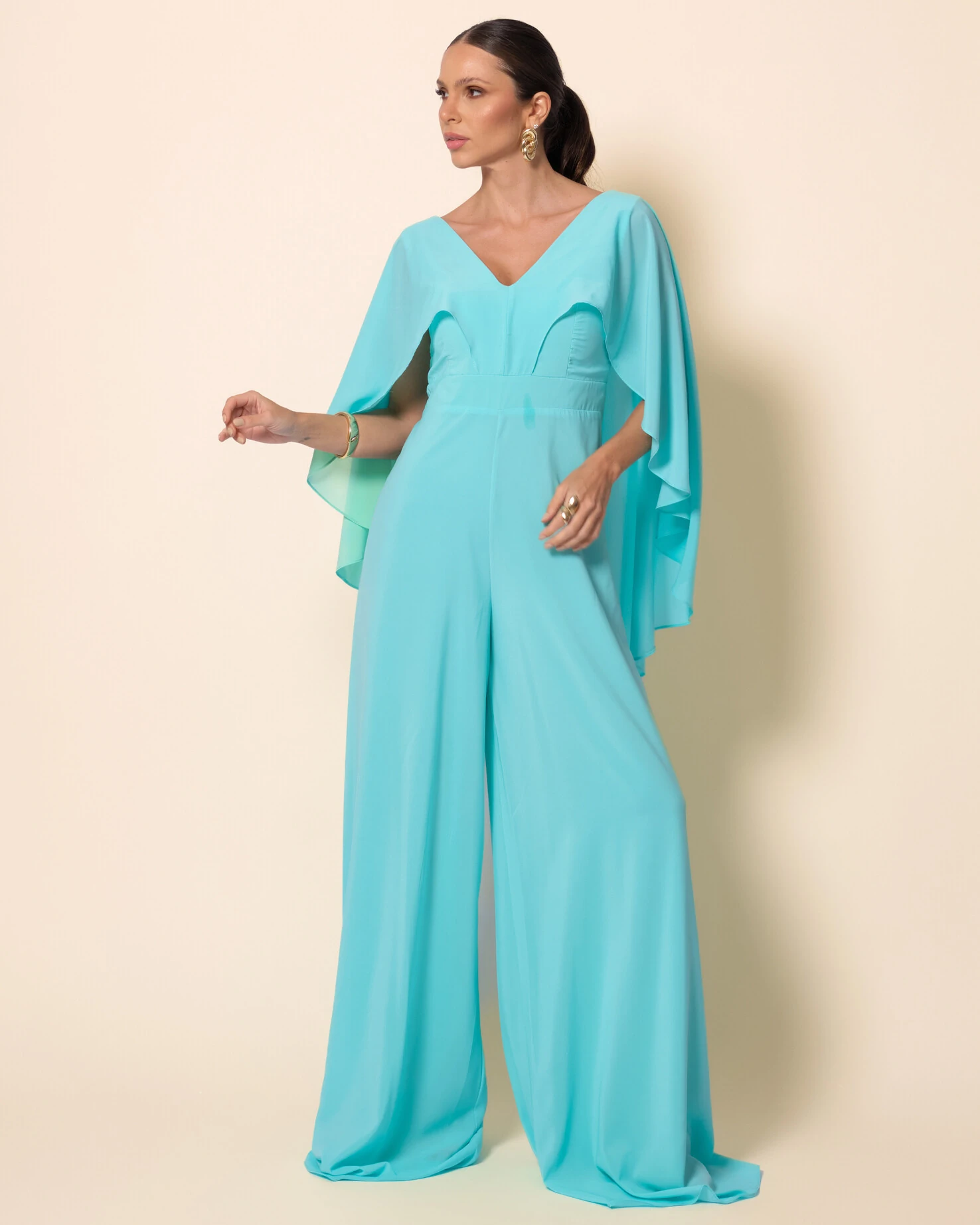 Macacão de Festa Longo Crepe Chiffon com Capa Tiffany