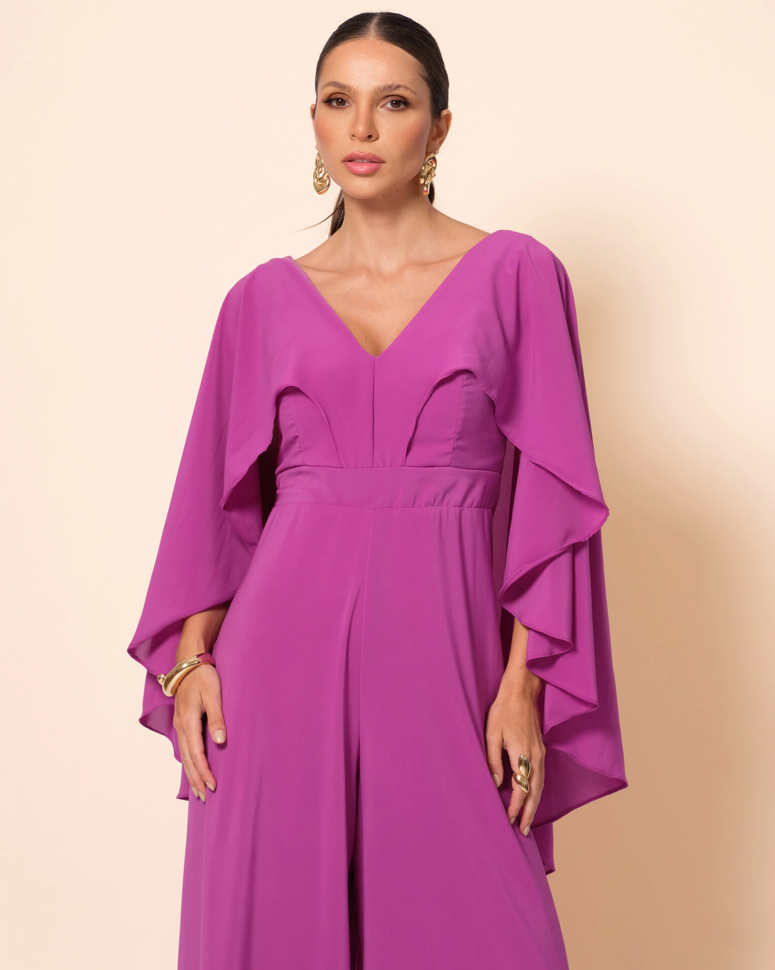 Macacão longo confeccionado em crepe, com caimento leve e elegante, decote em V que valoriza o colo, mangas amplas estilo capa que trazem fluidez ao visual e modelagem reta que alonga a silhueta, unindo conforto e sofisticação em cada detalhe.
