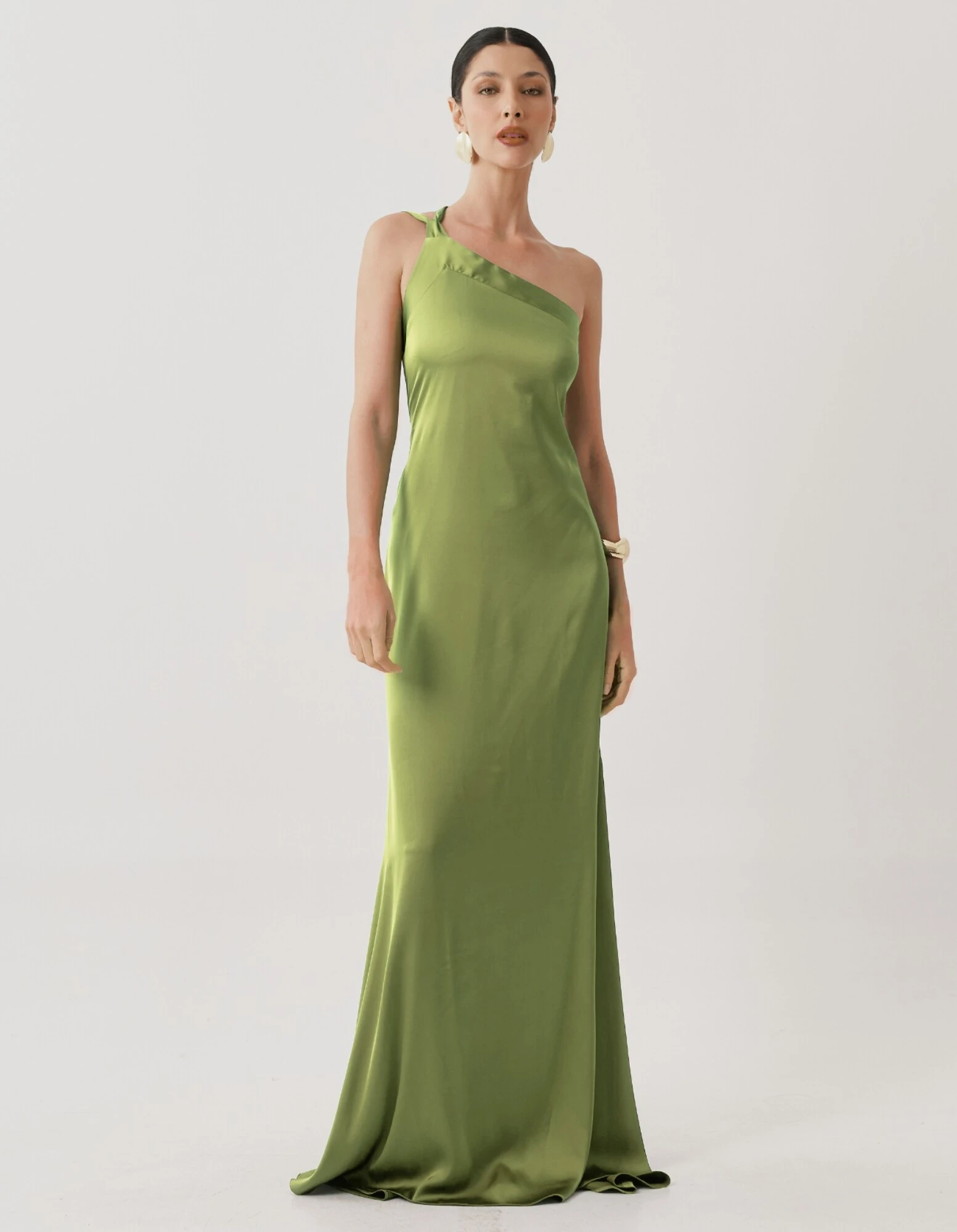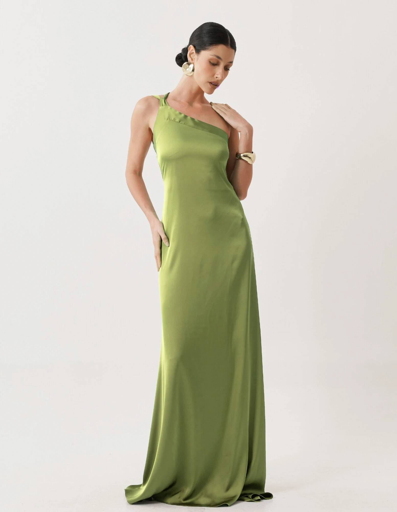 Vestido de Festa Longo Cetim Fluido Um Ombro Só Amarração Costas Verde Pistache