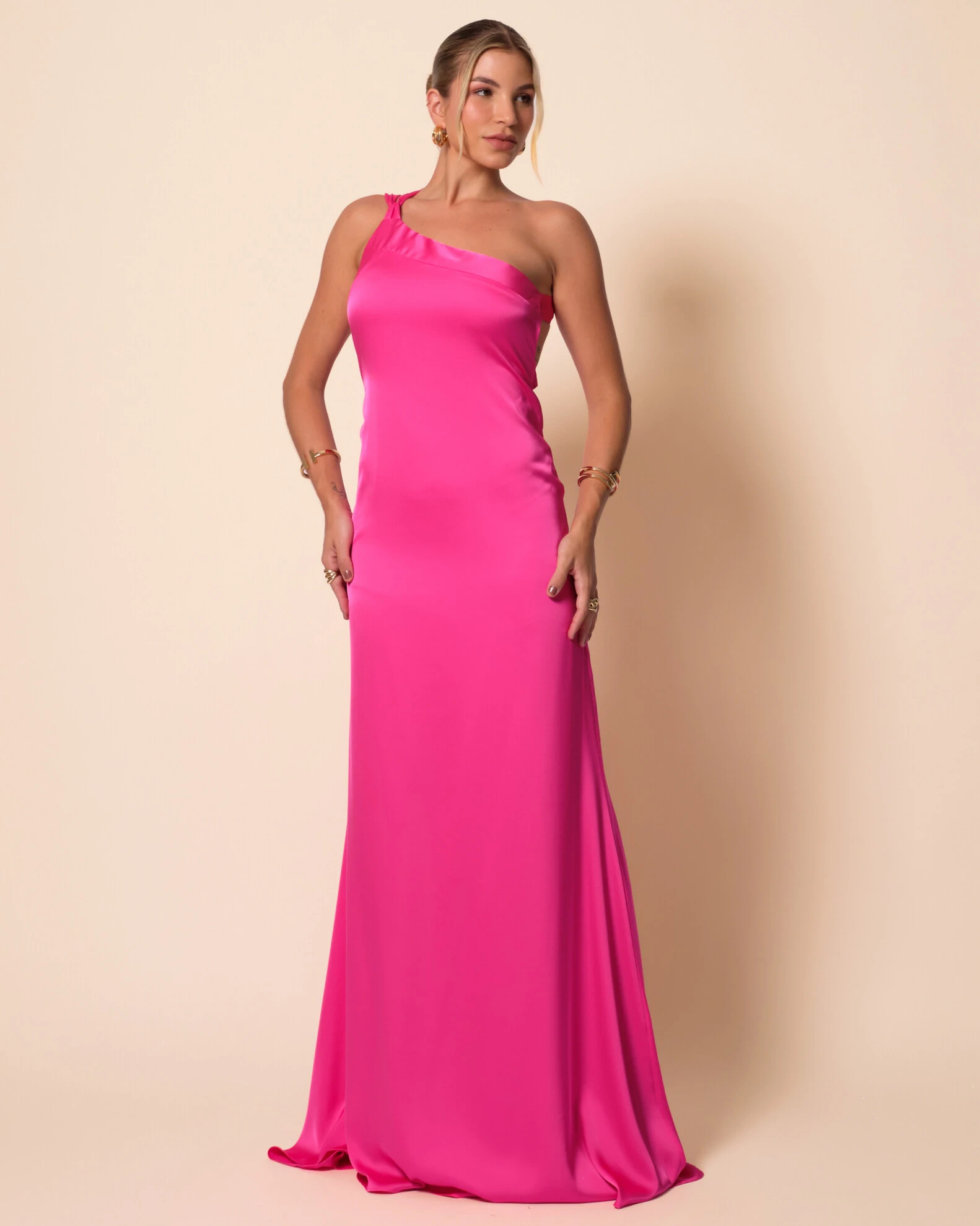 Vestido de Festa Longo Cetim Fluido Um Ombro Só Amarração Costas Pink