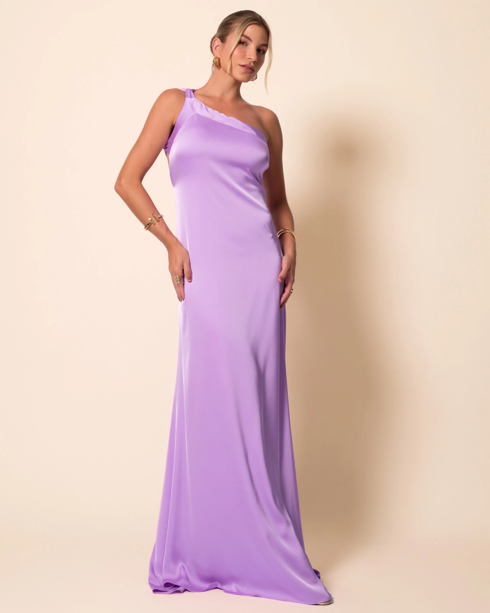 Vestido de Festa Longo Cetim Fluido Um Ombro Só Amarração Costas Lilás