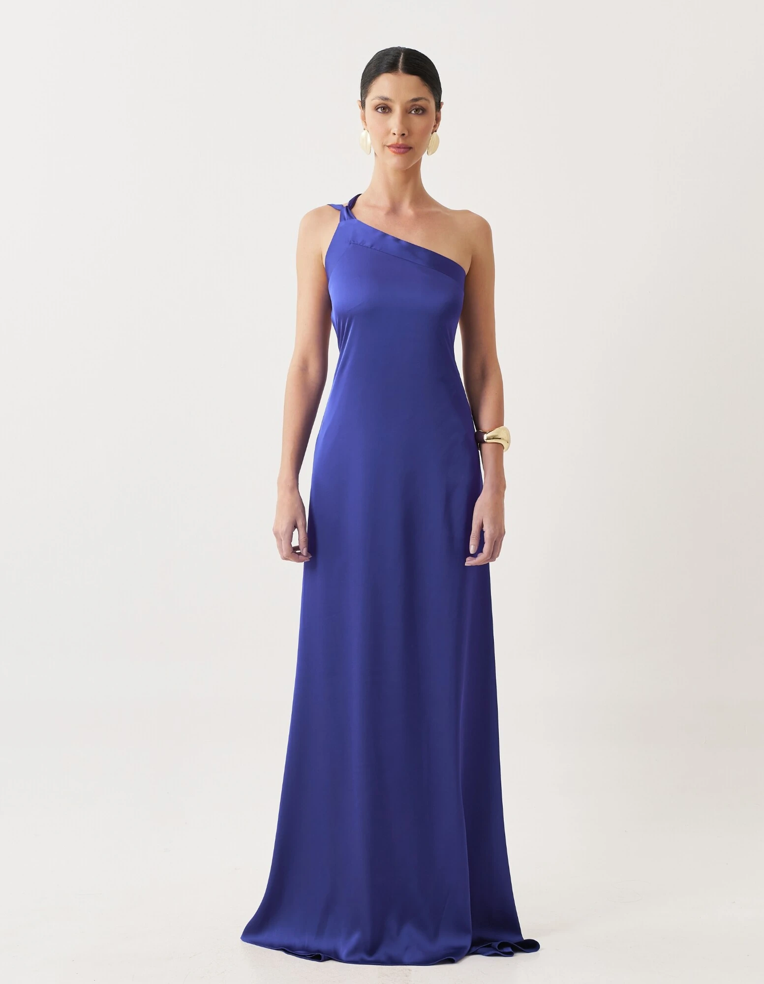 Vestido longo confeccionado em cetim, com caimento leve e toque acetinado que realça a fluidez da peça. Possui decote assimétrico com detalhe drapeado no busto, alça única delicada e modelagem reta que acompanha suavemente a silhueta. As costas contam com amarração, permitindo ajuste personalizado ao corpo, enquanto o acabamento limpo valoriza a proposta minimalista e sofisticada do design.