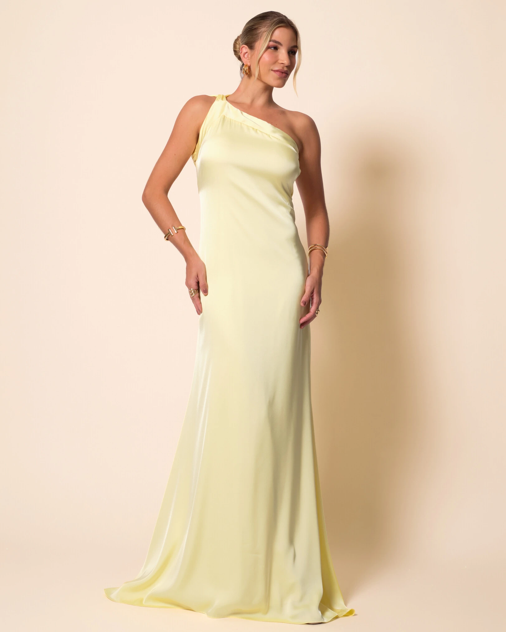 Vestido longo confeccionado em cetim, com caimento leve e toque acetinado que realça a fluidez da peça. Possui decote assimétrico com detalhe drapeado no busto, alça única delicada e modelagem reta que acompanha suavemente a silhueta. As costas contam com amarração, permitindo ajuste personalizado ao corpo, enquanto o acabamento limpo valoriza a proposta minimalista e sofisticada do design.