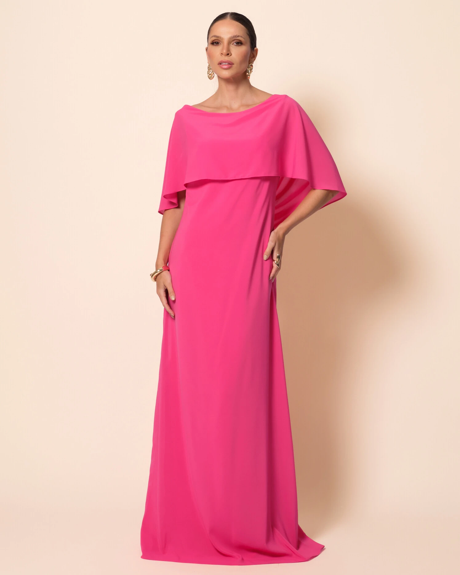 Vestido longo confeccionado em crepe chiffon, com caimento leve e fluido que acompanha suavemente os movimentos do corpo, modelagem reta que alonga a silhueta, decote ombro a ombro com sobreposição em formato de capa que cria um efeito elegante e estruturado na parte frontal, e costas com decote em degagê, trazendo delicadeza e sofisticação ao visual, além de acabamento refinado que valoriza a fluidez do tecido e o design minimalista da peça.