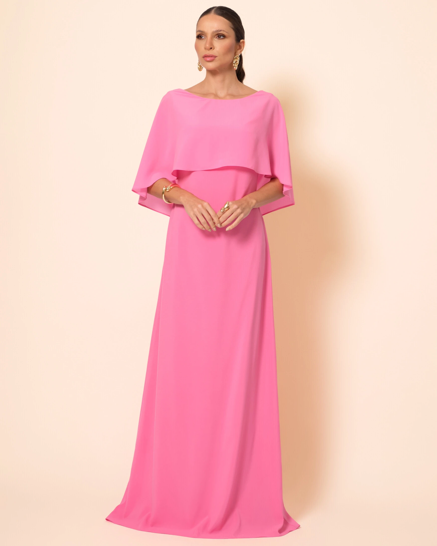 Vestido de Festa Longo Crepe Chiffon com Capa e Degagê nas Costas Rosa