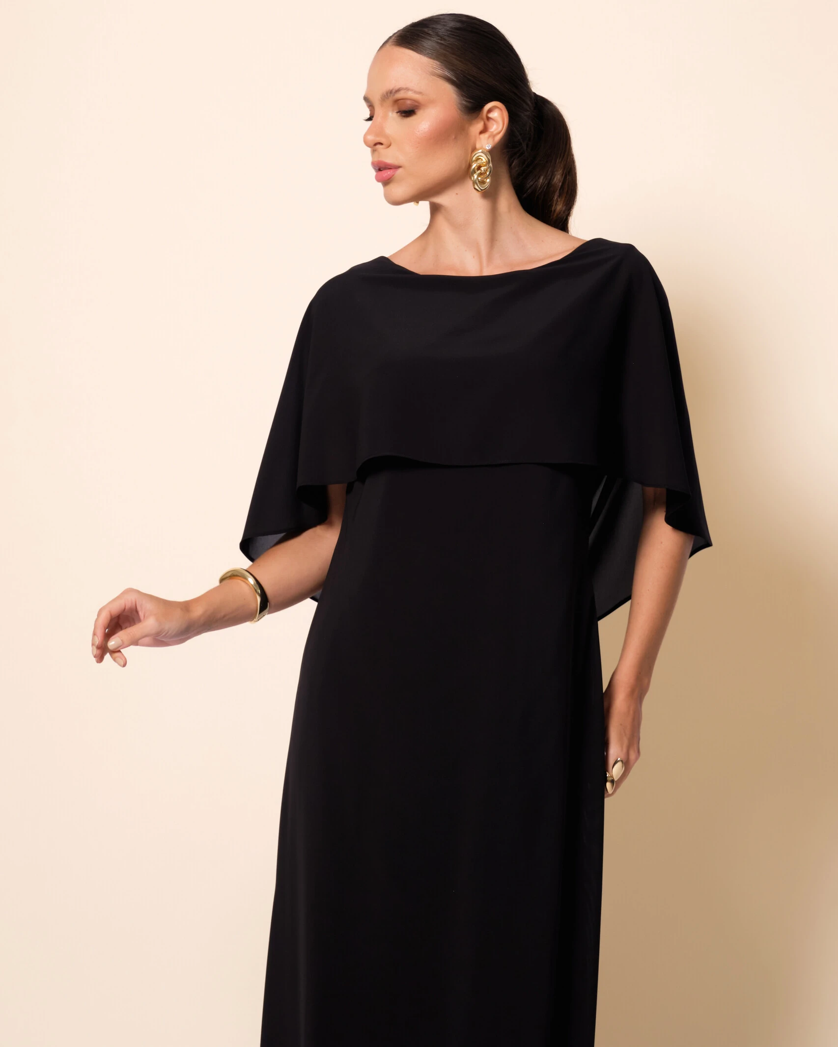 Vestido longo confeccionado em crepe chiffon, com caimento leve e fluido que acompanha suavemente os movimentos do corpo, modelagem reta que alonga a silhueta, decote ombro a ombro com sobreposição em formato de capa que cria um efeito elegante e estruturado na parte frontal, e costas com decote em degagê, trazendo delicadeza e sofisticação ao visual, além de acabamento refinado que valoriza a fluidez do tecido e o design minimalista da peça.