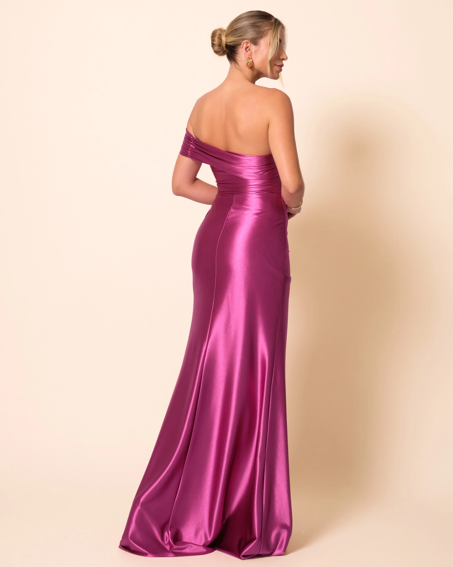 Confeccionado em cetim malha metálico, o vestido possui modelagem de um ombro só, com detalhe franzido que valoriza o busto de forma elegante. A silhueta ajustada destaca a cintura e o quadril com drapeados estratégicos, enquanto a saia longa apresenta caimento fluido, garantindo movimento, sofisticação e um acabamento impecável.