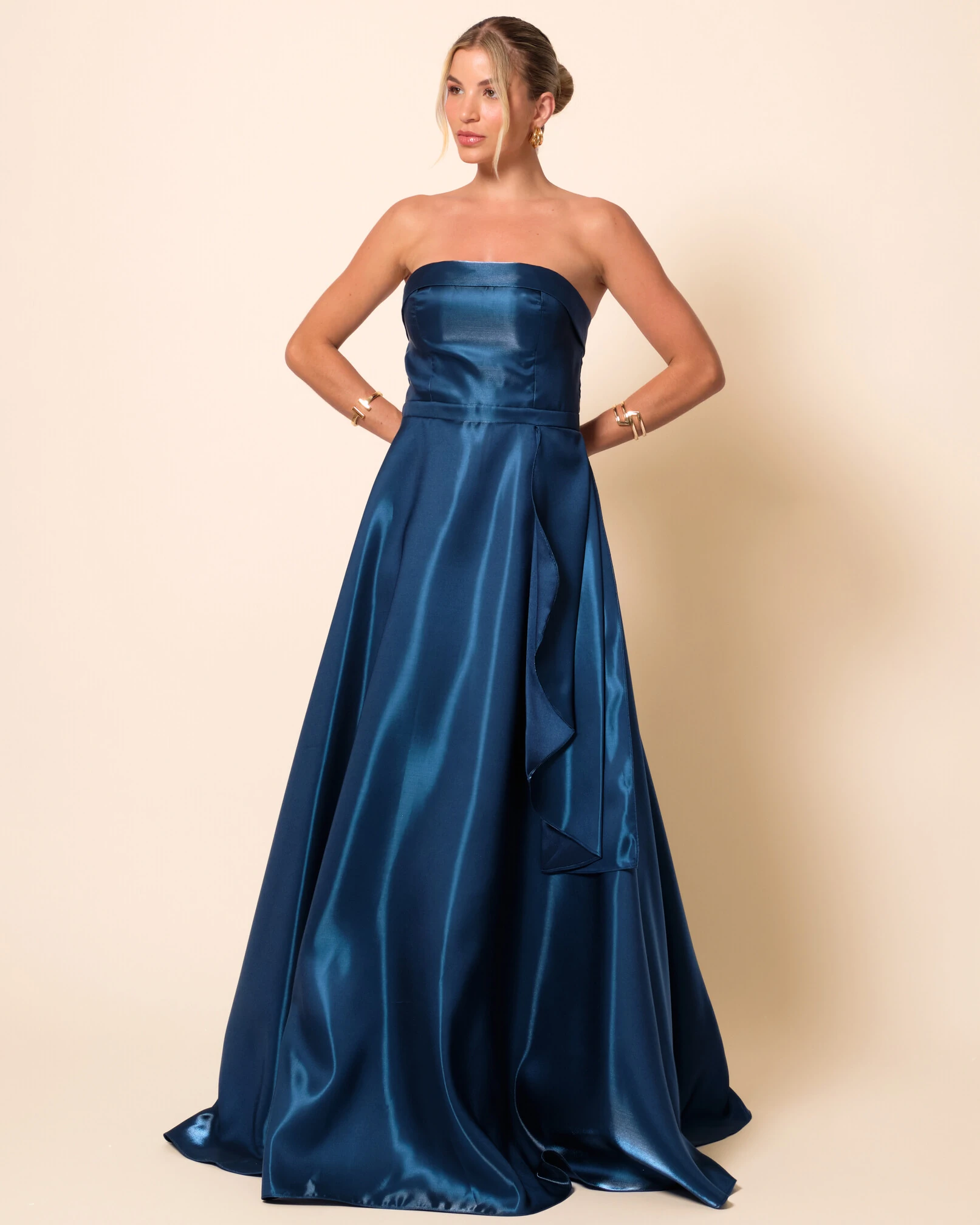 VESTIDO DE FESTA LONGO ZIBELINE CRISTAL TOMARA QUE CAIA DETALHE - Este vestido longo possui modelagem clássica e elegante, com decote tomara que caia que valoriza o colo e estrutura ajustada no busto e na cintura, criando uma silhueta feminina e equilibrada. A saia ampla com caimento fluido ganha charme extra com o detalhe de sobreposição lateral, que adiciona movimento e sofisticação ao visual. Ideal para casamentos, formaturas, eventos noturnos e festas especiais, combina perfeitamente com sandálias de salto fino, clutch delicada e acessórios elegantes, como brincos alongados ou colares sutis, garantindo uma produção refinada e atemporal.