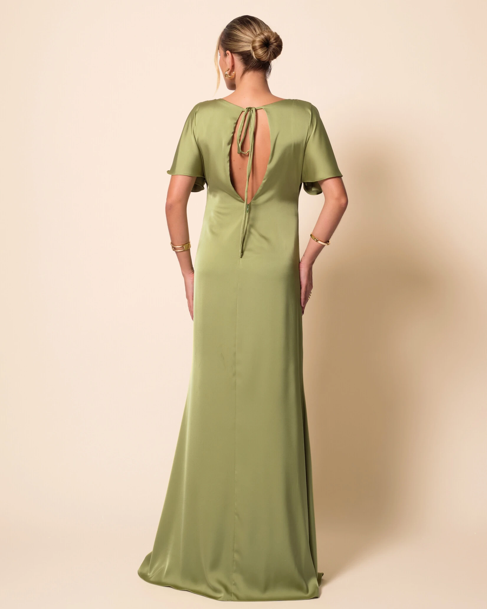 VESTIDO DE FESTA LONDO CETIM FLUIDO MANGA CURTA DRAPEADO - Vestido longo com caimento fluido e elegante, trazendo mangas amplas que criam movimento e um decote delicado que valoriza o colo com sofisticação. A cintura levemente marcada com franzido central ajuda a alongar a silhueta, enquanto a saia reta garante um visual clássico e atemporal. É uma escolha perfeita para ocasiões formais como casamentos (inclusive como madrinha), formaturas, jantares de gala e eventos noturnos em salões, hotéis ou espaços sofisticados. Para complementar, aposte em brincos médios ou longos, pulseiras delicadas, clutch estruturada e sandálias de salto fino, mantendo a proposta elegante e refinada.