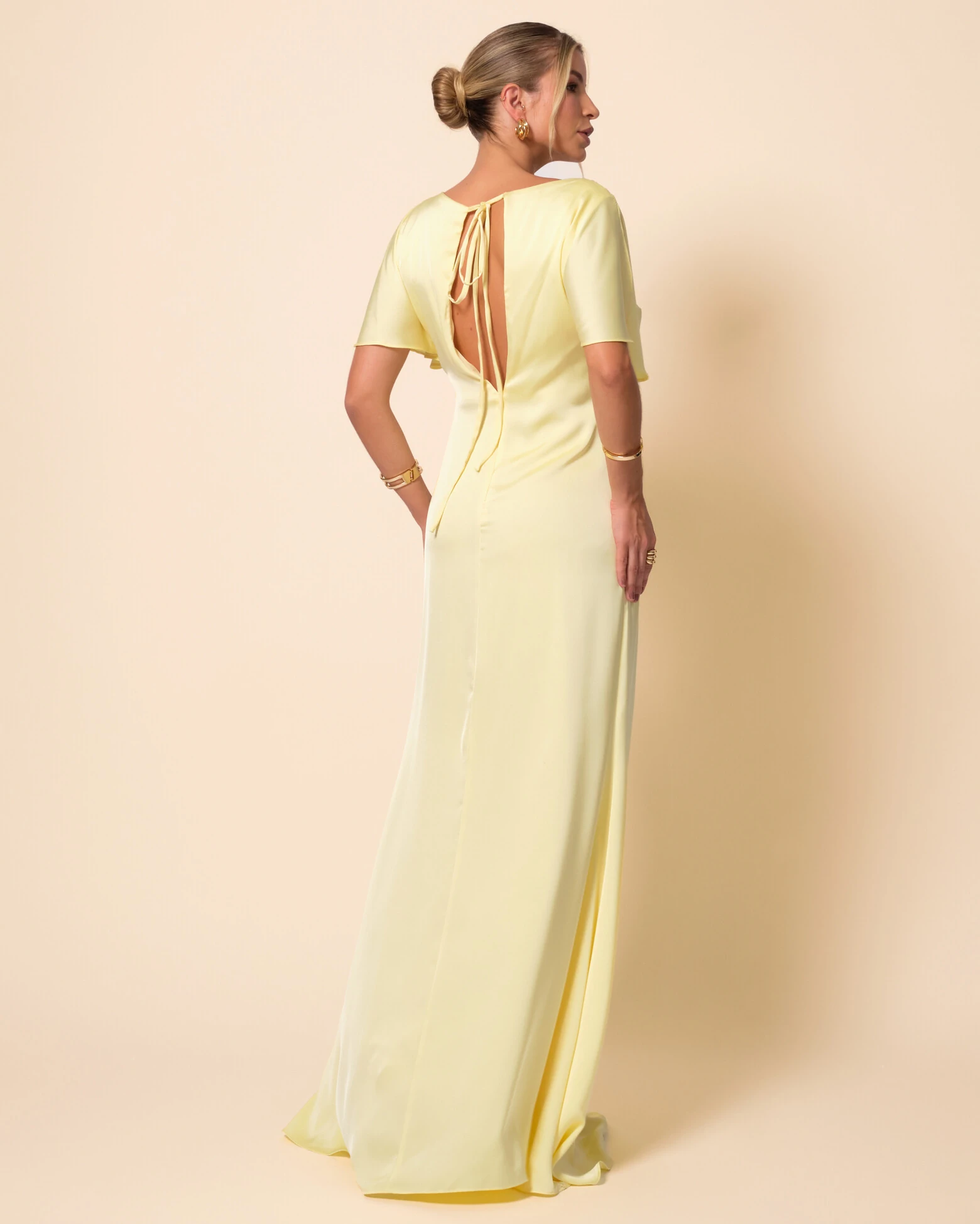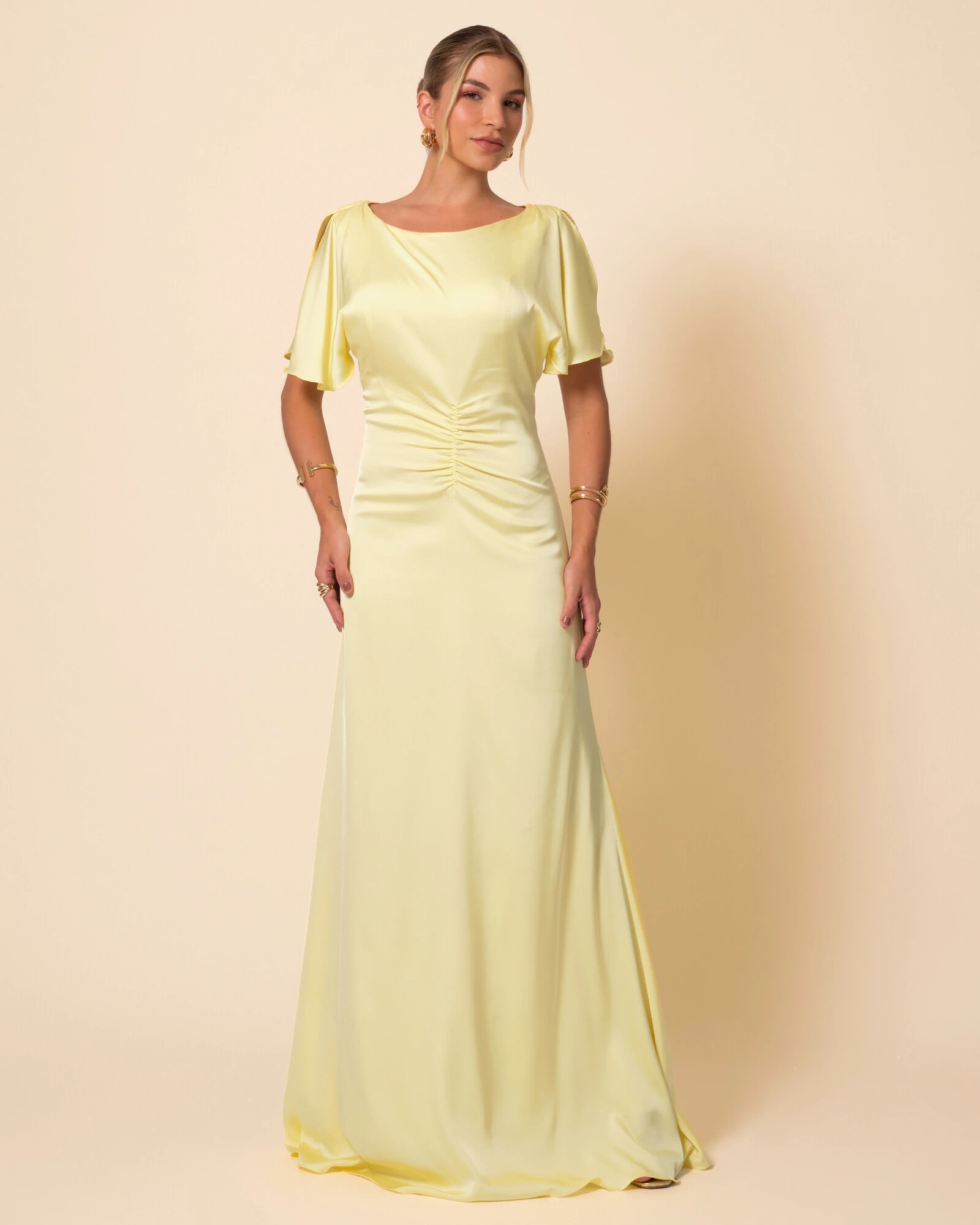 Vestido de Festa Longo Cetim Fluido Manga Curta Drapeado Amarelo Manteiga