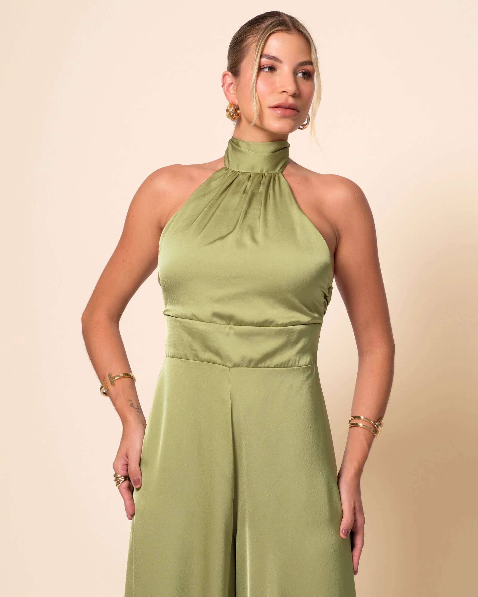 Macacão longo confeccionado em cetim, com brilho suave e toque acetinado, apresentando gola alta com leve franzido que valoriza o busto, recorte ajustado que define a cintura e caimento fluido ao longo das pernas, garantindo elegância e movimento. O grande destaque fica para as costas abertas, que adicionam sensualidade na medida certa e equilibram a sofisticação da frente com um acabamento moderno e refinado.