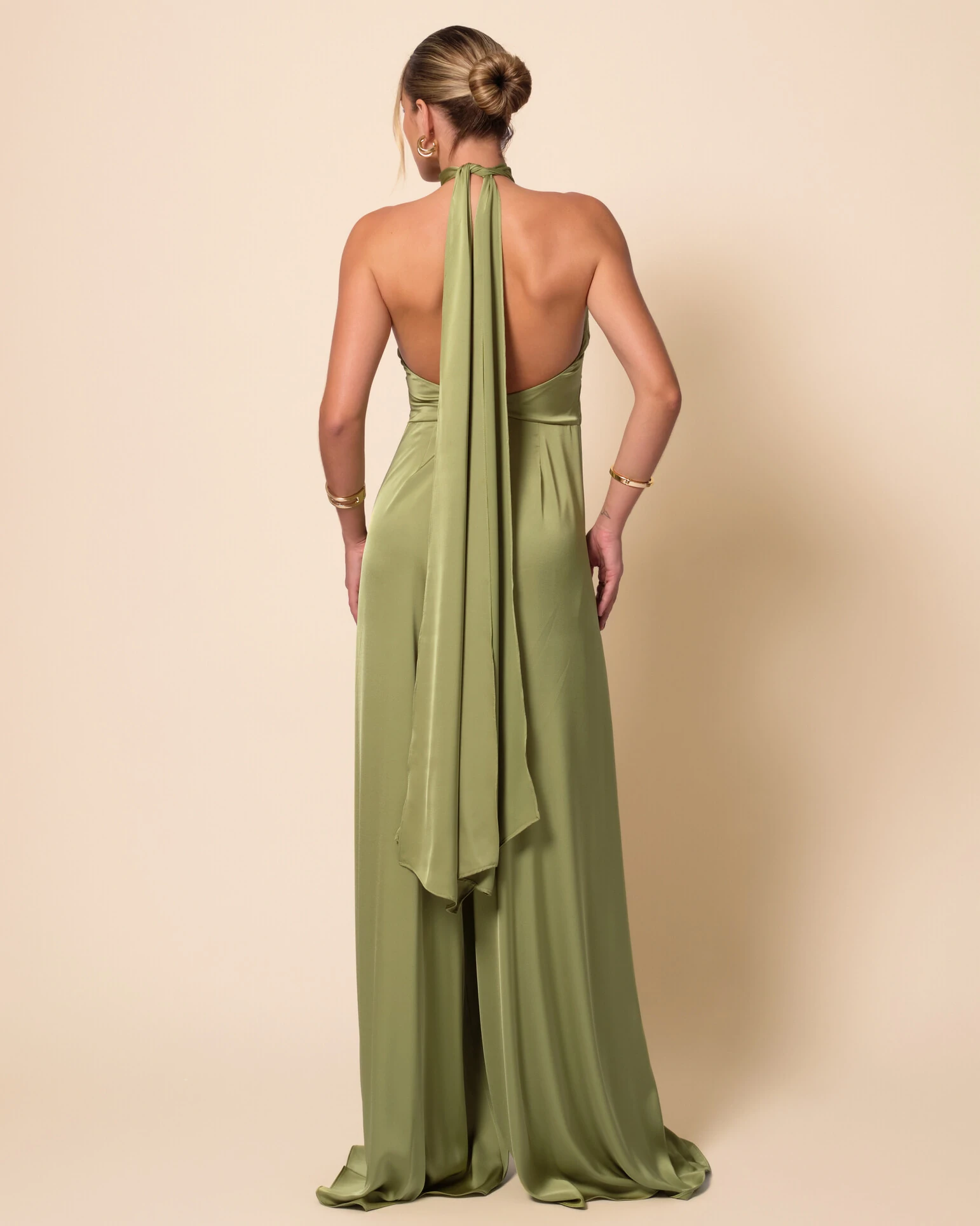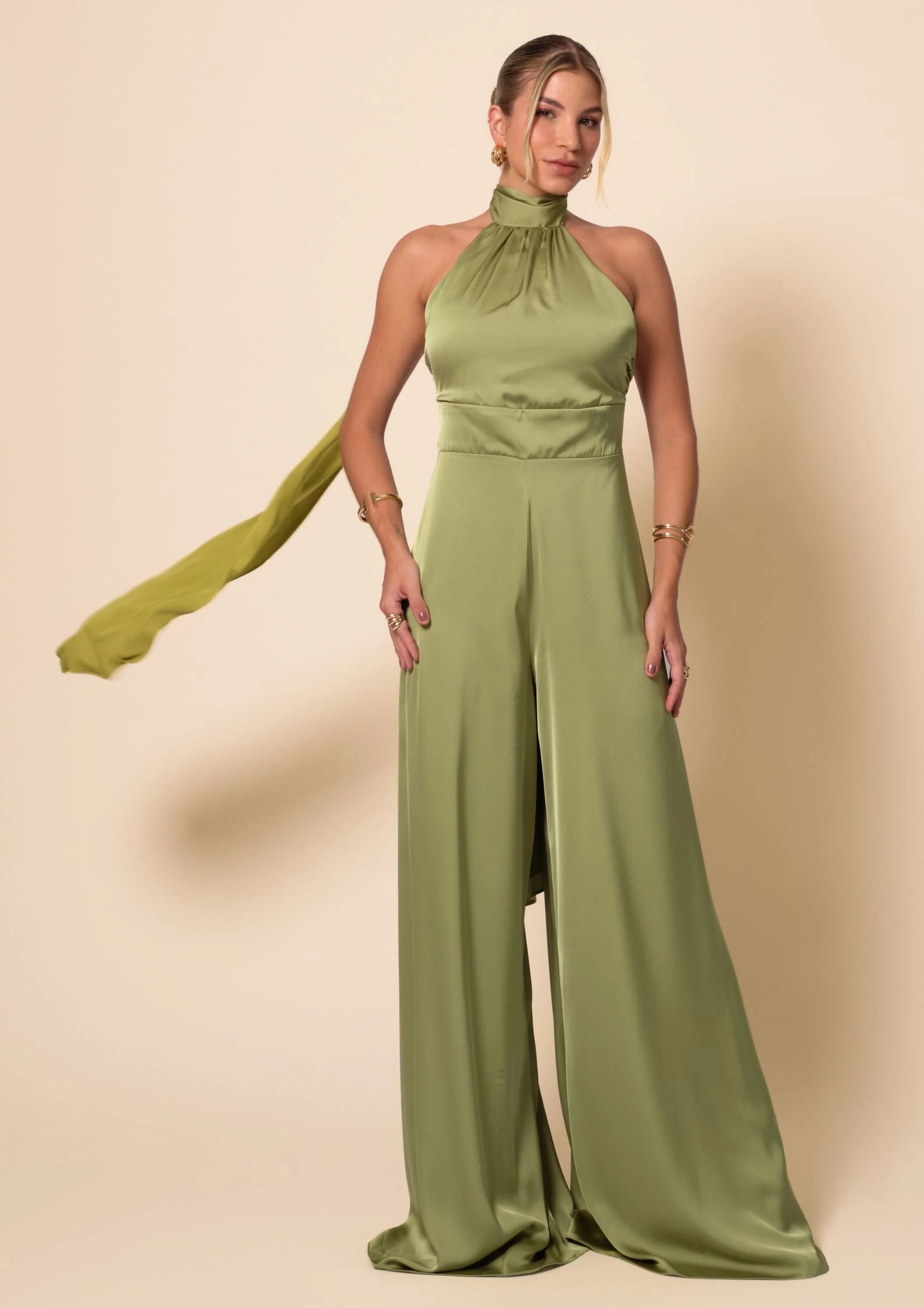 Macacão de Festa Longo em Cetim Fluido com Gola Alta e Lenço Verde Pistache