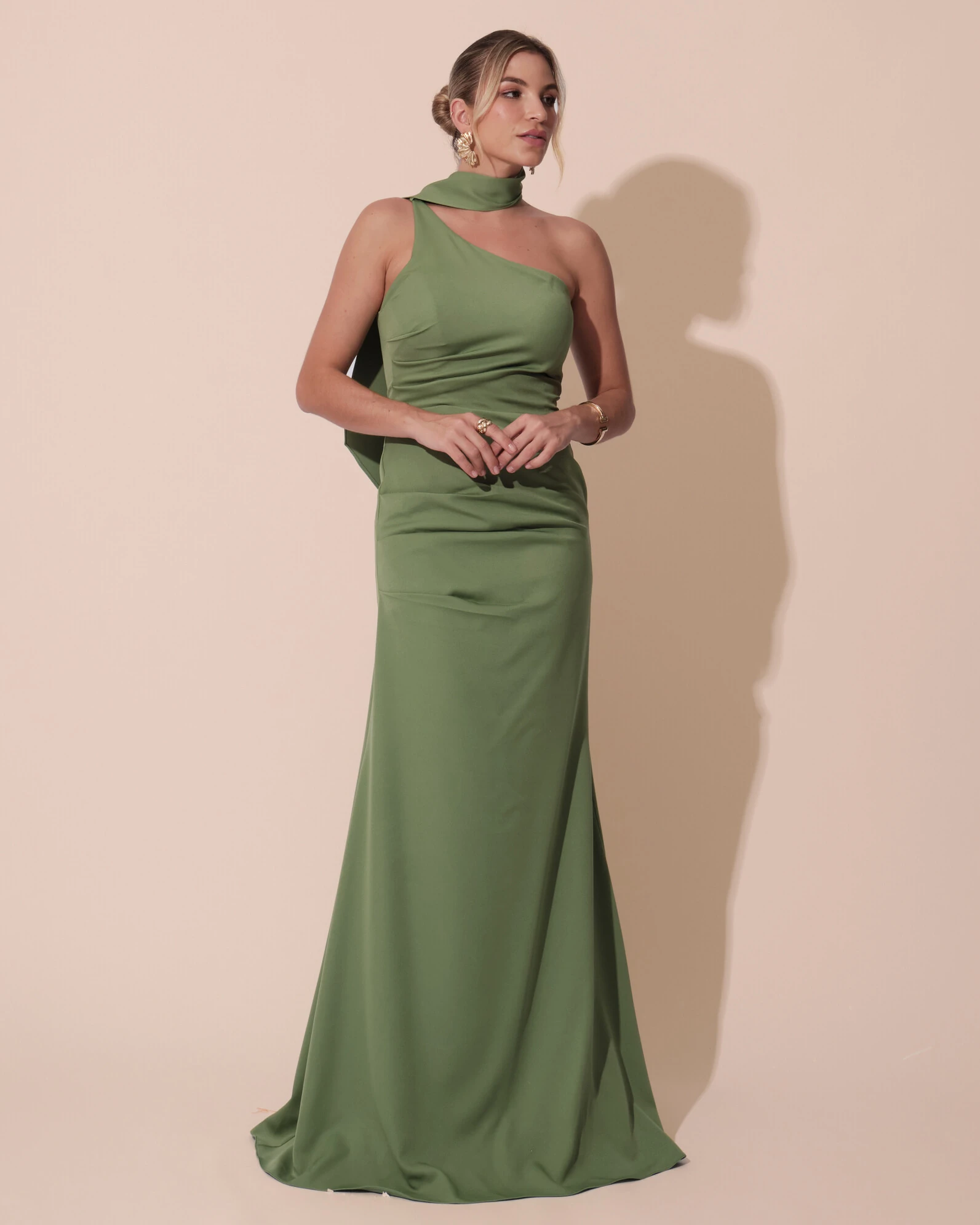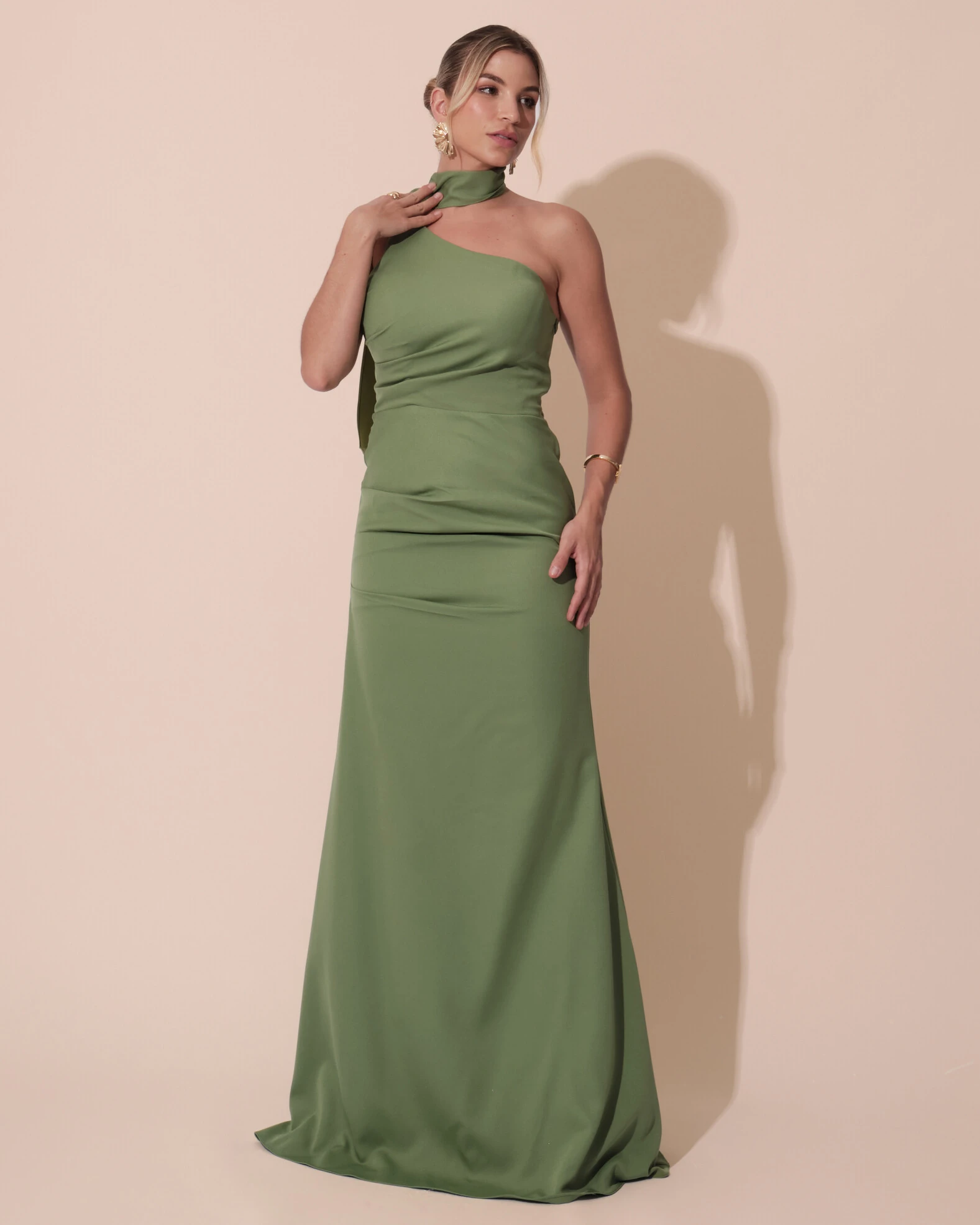 Vestido de Festa Longo Alfaiataria Um Ombro Só Detalhe Drapeado Verde Matcha