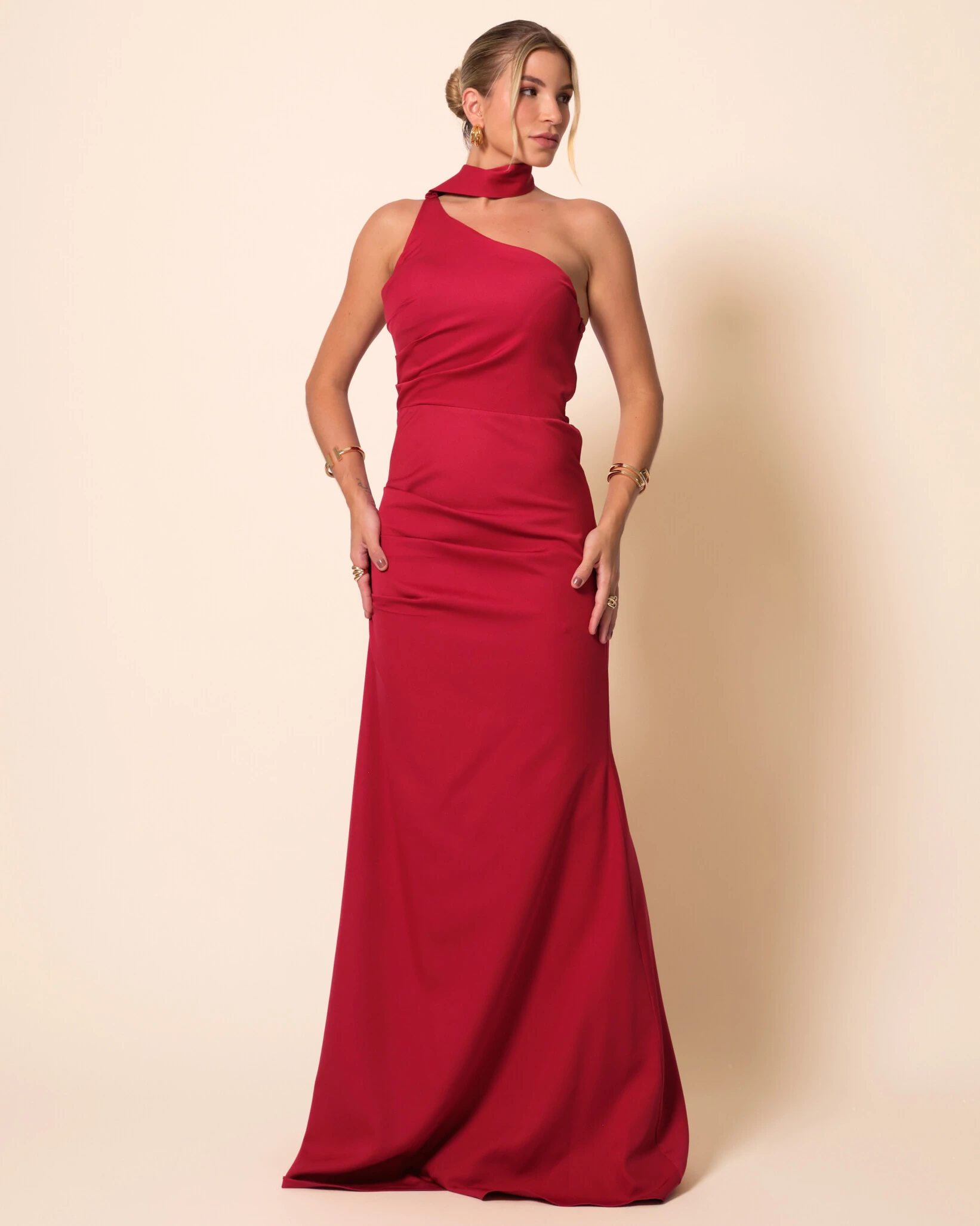 Vestido de Festa Longo Alafataria Um Ombro Só Detalhe Drapeado Cereja