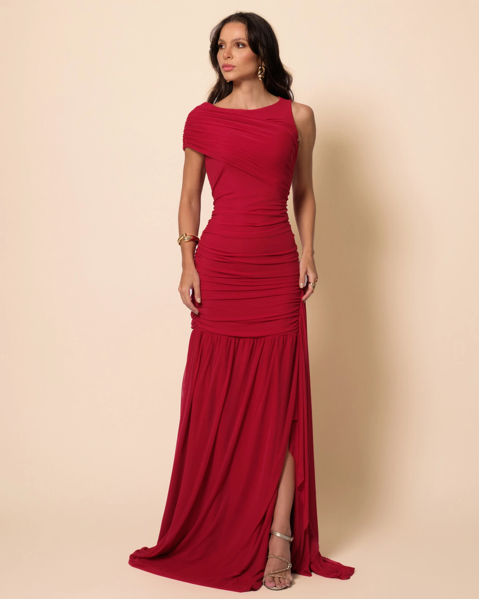 Vestido longo confeccionado em tule, com modelagem ajustada na parte superior e caimento fluido na saia. Possui decote assimétrico que destaca o colo, além de drapeados delicados e bem distribuídos ao longo do busto, cintura e quadril, criando efeito de movimento e valorizando a silhueta. A saia apresenta leve transparência e franzidos sutis, conferindo leveza, feminilidade e um acabamento suave e elegante ao design.