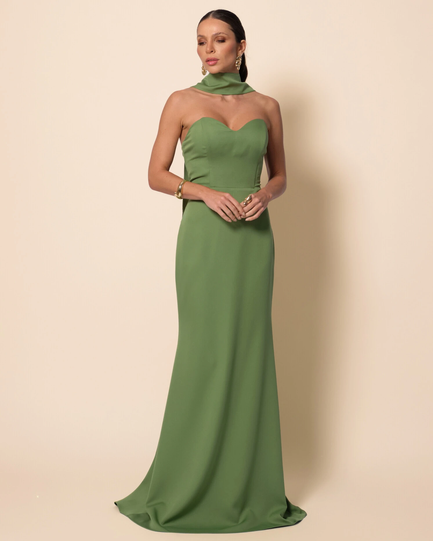 Vestido de Festa Longo Alfaiataria Tomara que Caia Saia Sereia com Lenço Verde Matcha
