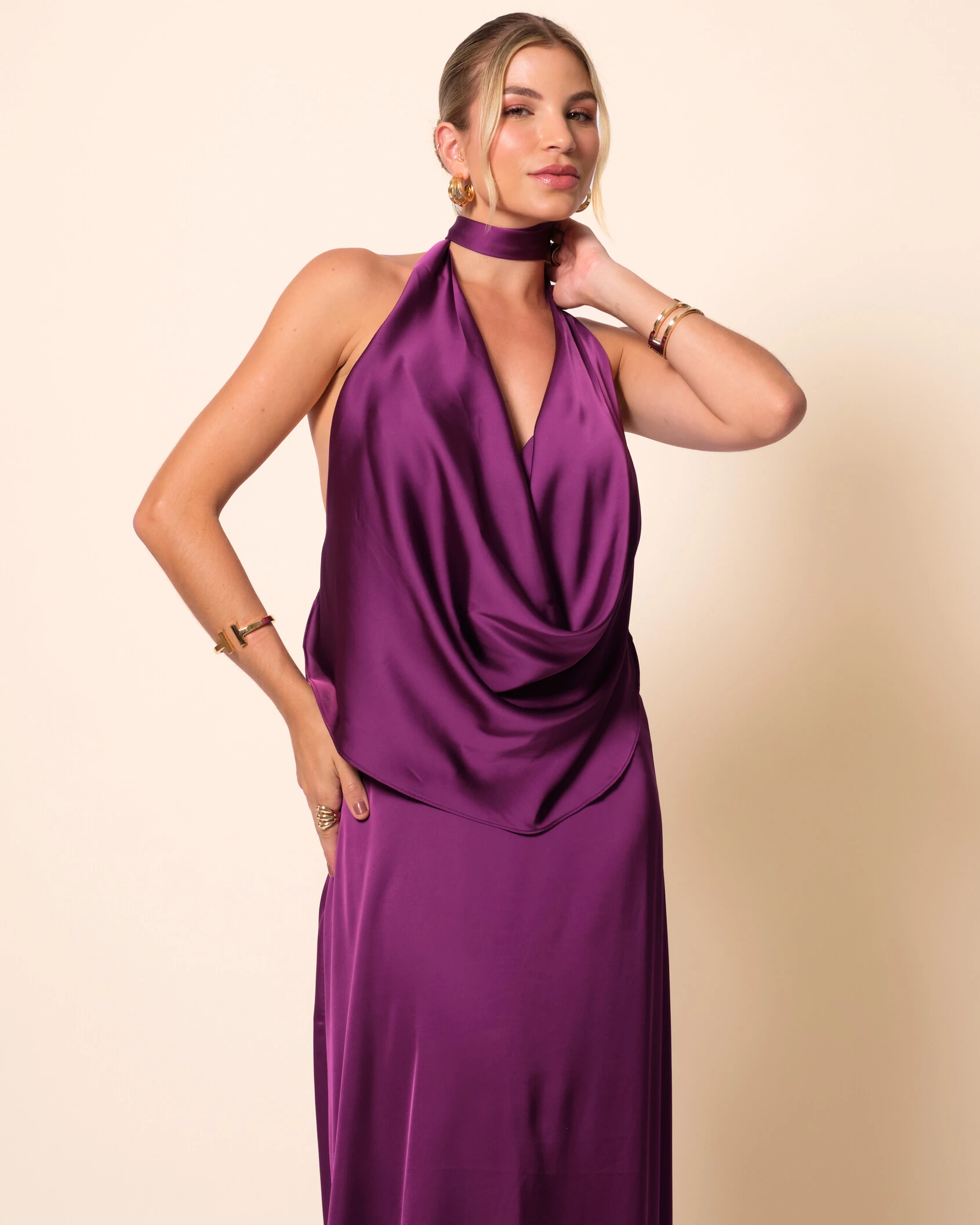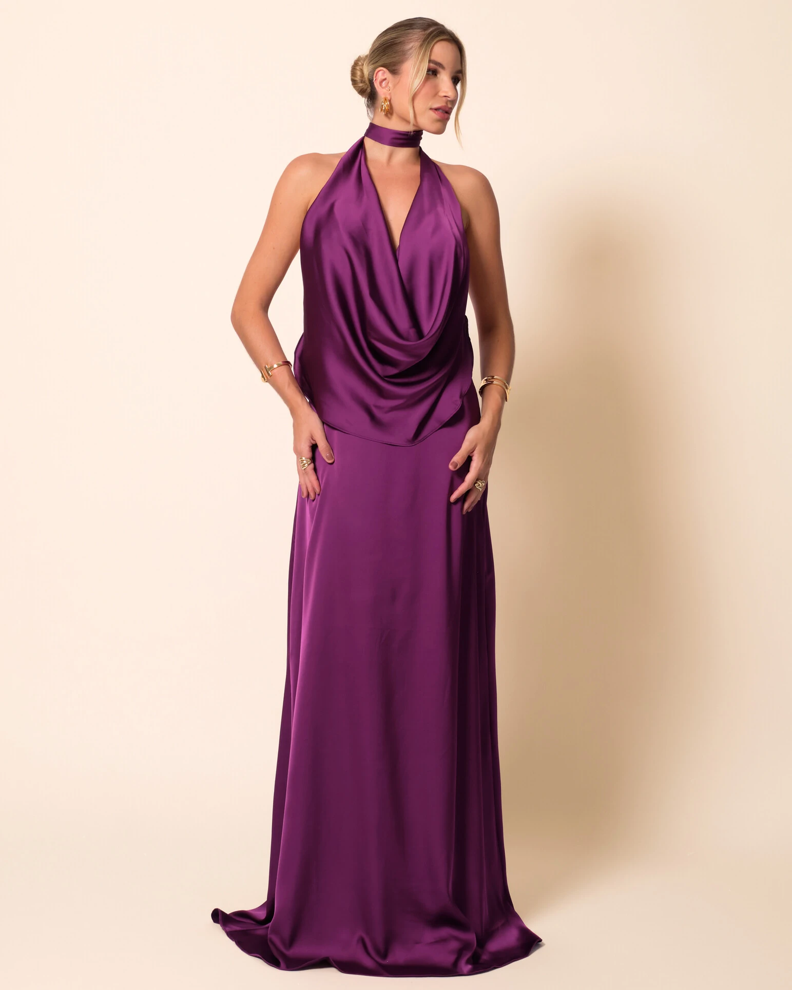 Vestido longo confeccionado em cetim, com caimento fluido e acabamento acetinado que confere sofisticação à peça. Possui decote halter profundo, valorizando o colo, além de drapeado delicado na parte frontal que cria movimento e elegância ao design. A modelagem segue de forma alongada e limpa, acompanhando o corpo com leveza, resultando em uma silhueta refinada e atemporal.