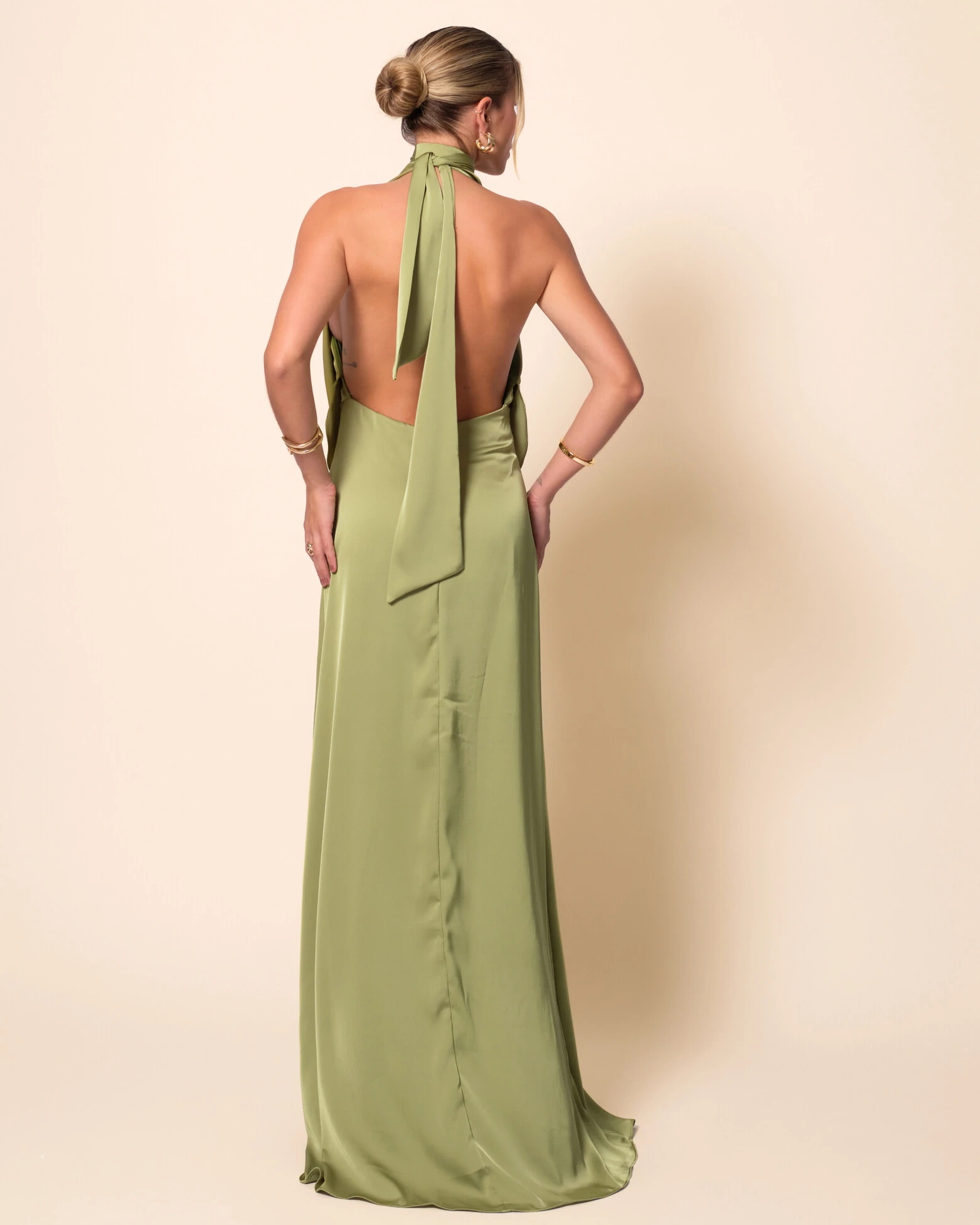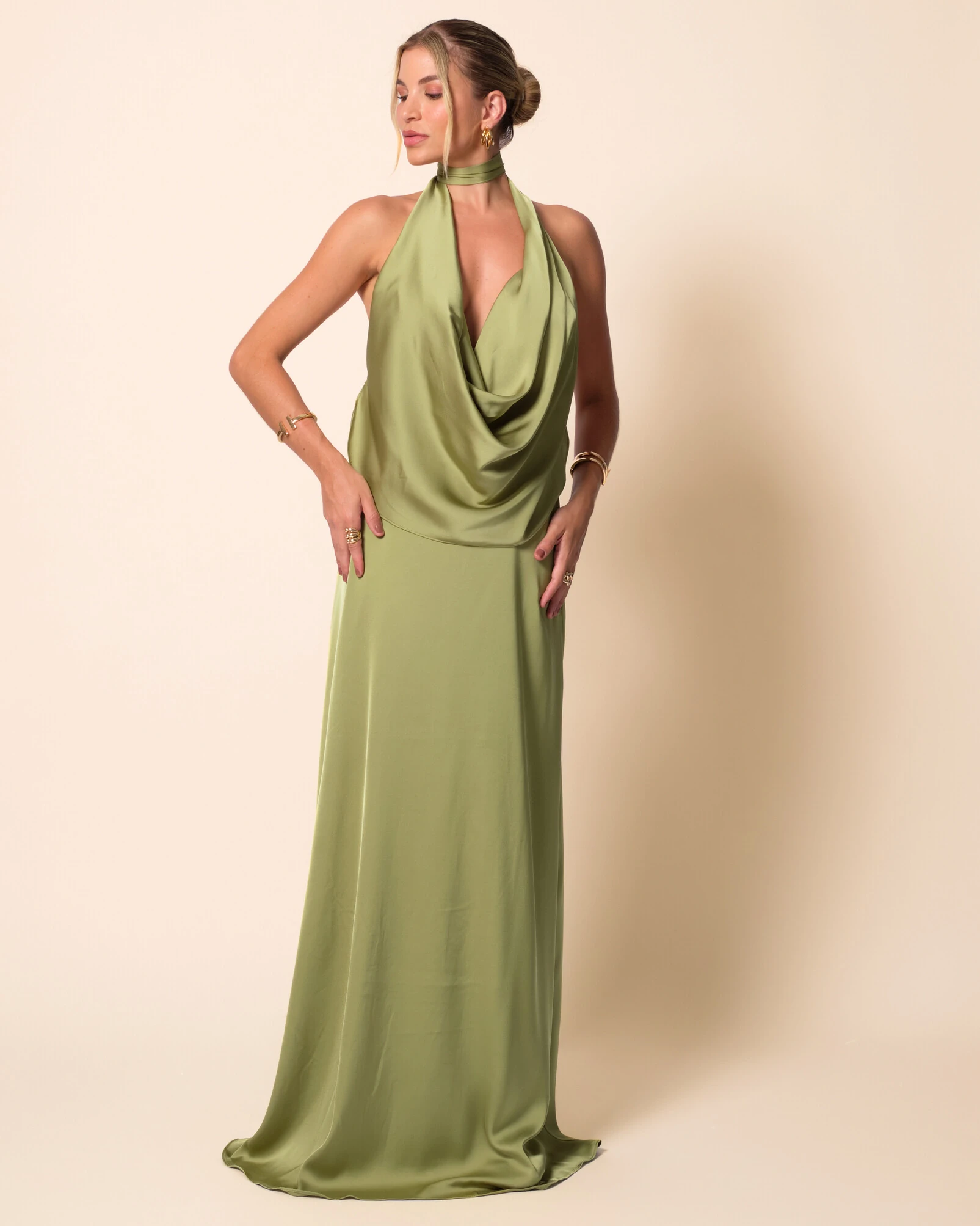 Vestido longo confeccionado em cetim, com caimento fluido e acabamento acetinado que confere sofisticação à peça. Possui decote halter profundo, valorizando o colo, além de drapeado delicado na parte frontal que cria movimento e elegância ao design. A modelagem segue de forma alongada e limpa, acompanhando o corpo com leveza, resultando em uma silhueta refinada e atemporal.