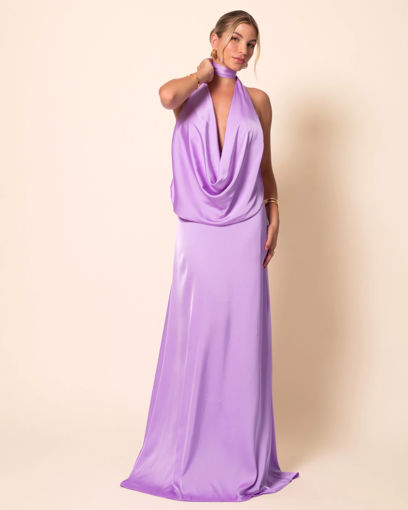 Vestido longo confeccionado em cetim, com caimento fluido e acabamento acetinado que confere sofisticação à peça. Possui decote halter profundo, valorizando o colo, além de drapeado delicado na parte frontal que cria movimento e elegância ao design. A modelagem segue de forma alongada e limpa, acompanhando o corpo com leveza, resultando em uma silhueta refinada e atemporal.