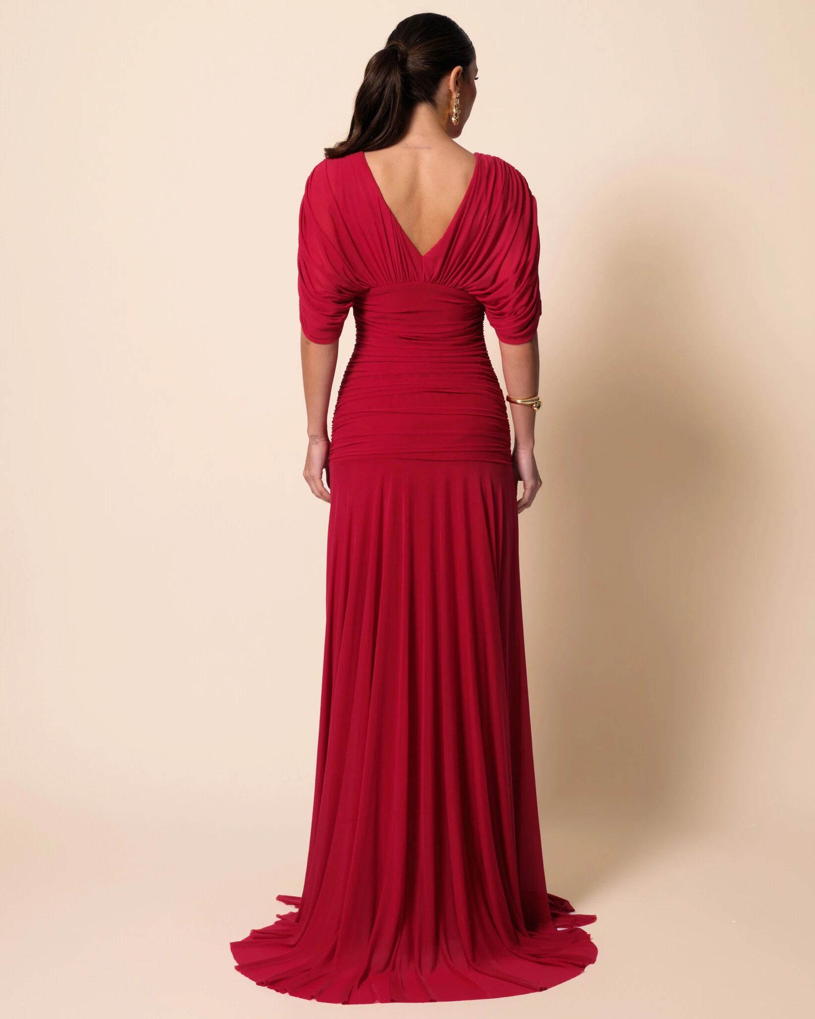 VESTIDO DE FESTA LONGO TULE MANGA CURTA DRAPEADO - Vestido longo com modelagem elegante e sofisticada, destacando decote em V profundo que valoriza o colo e mangas amplas drapeadas que trazem imponência e fluidez ao visual. A cintura marcada com efeito franzido realça a silhueta, enquanto a saia alongada com caimento leve cria movimento e presença a cada passo. Ideal para casamentos noturnos, formaturas, eventos de gala e premiações, ele combina perfeitamente com brincos statement dourados ou com pedrarias, pulseiras delicadas ou braceletes estruturados e clutch minimalista; nos pés, sandálias de tiras finas ou salto metalizado complementam a produção com sofisticação.