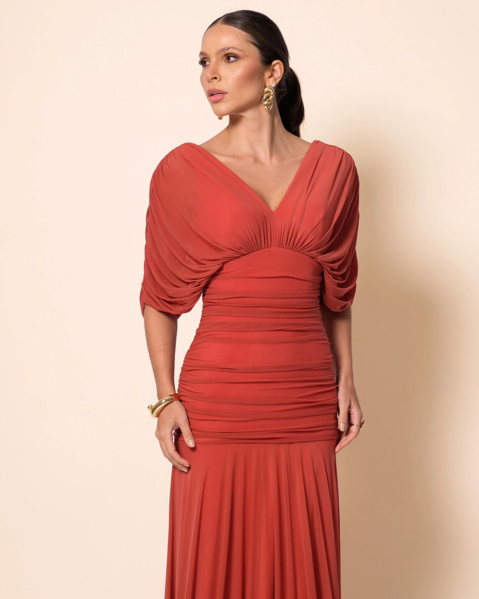 Vestido de Festa Longo Tule Manga Curta Drapeado Terracota