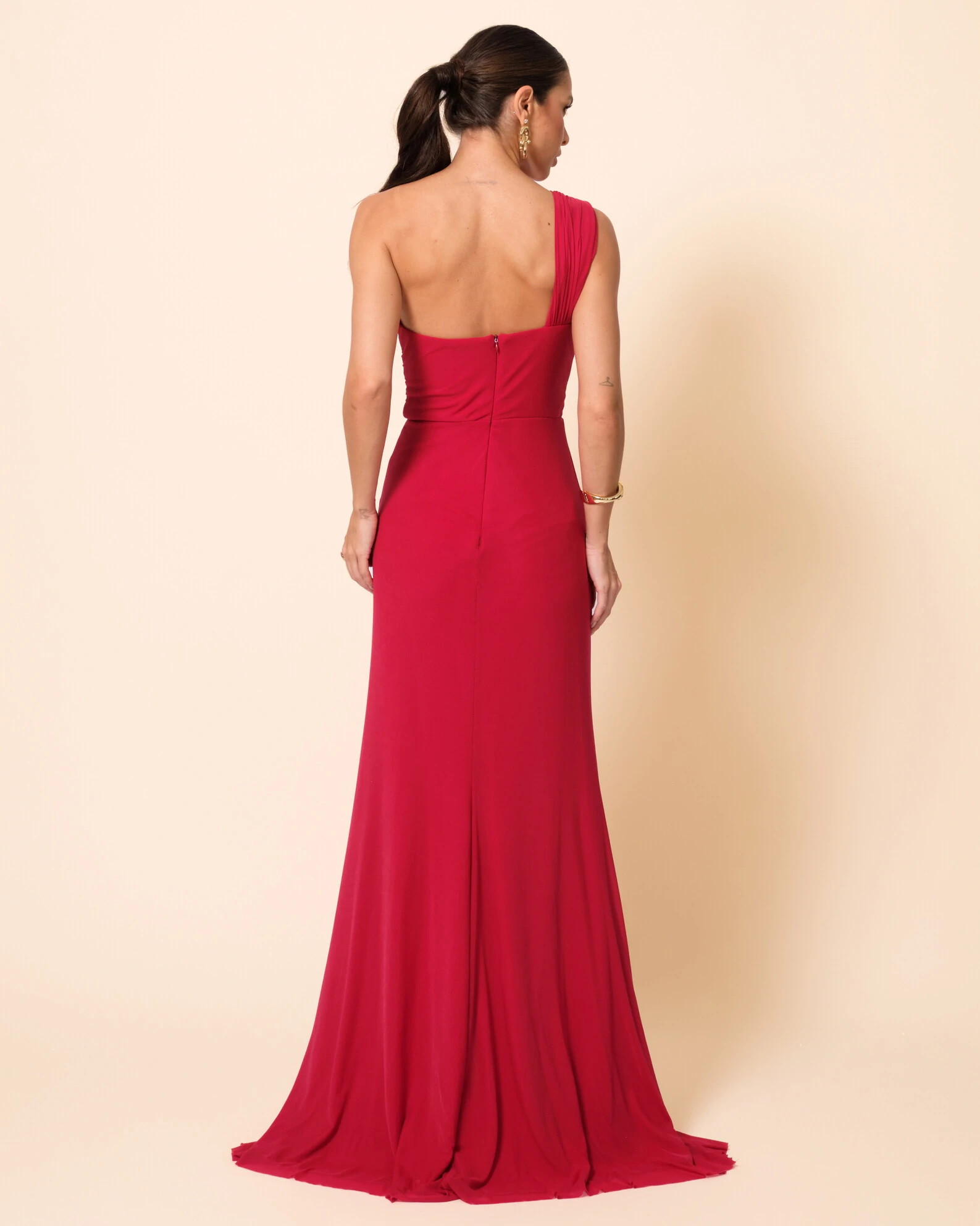 Vestido de festa longo confeccionado em tule, com uma fiaxa de um ombro só e busto estruturado com leve franzido, proporcionando melhor sustentação e acabamento delicado; o corpo apresenta drapeado estratégico que valoriza a silhueta, com recorte lateral e detalhe de faixa que desce suavemente, criando efeito alongador; a saia segue com caimento fluido, franzidos sutis e fenda frontal que garante movimento e leveza, finalizando com barra ampla e elegante.