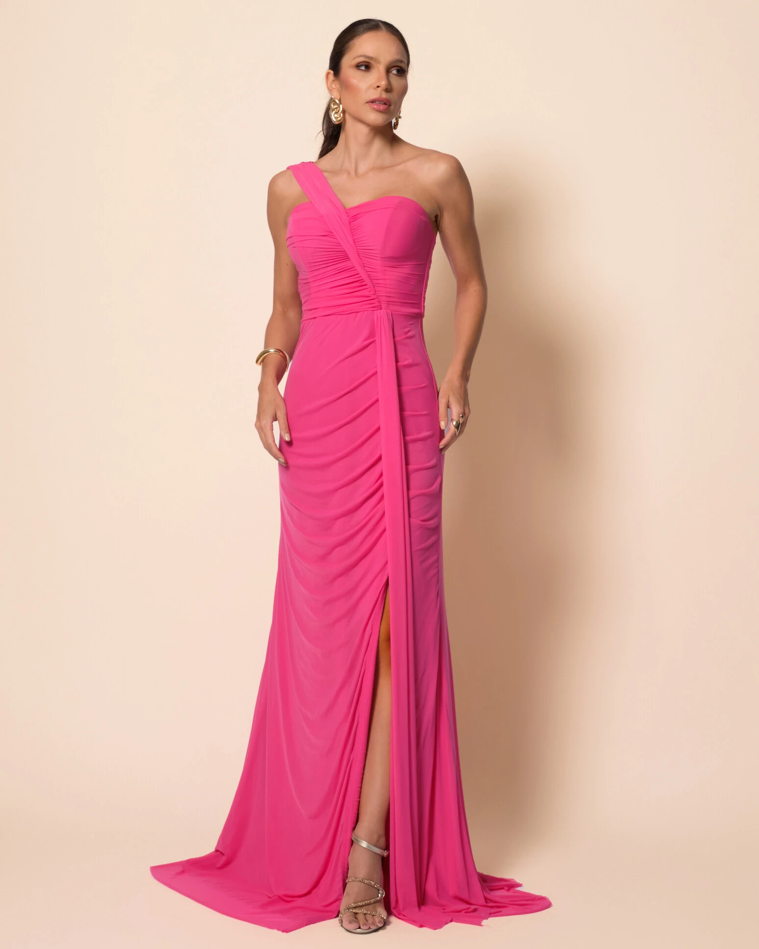 VESTIDO DE FESTA LONGO TULE TOMARA QUE CAIA FAIXA DETALHE DRAPEADO E FENDA -  Vestido de festa longo com design elegante e marcante, destacando o decote assimétrico de um ombro só e o drapeado estratégico ao longo do corpo, que valoriza a silhueta com sofisticação e um caimento impecável; a fenda frontal adiciona sensualidade na medida certa, enquanto o detalhe de faixa lateral traz movimento e charme extra à peça. Para complementar, aposte em brincos dourados mais imponentes, pulseiras delicadas e sandálias de tiras finas, criando um visual refinado e equilibrado. Ideal para ocasiões como casamentos, formaturas, eventos de gala ou festas noturnas, esse modelo também se destaca em ambientes elegantes como salões luxuosos, festas ao ar livre ao entardecer ou celebrações à beira-mar com clima sofisticado.