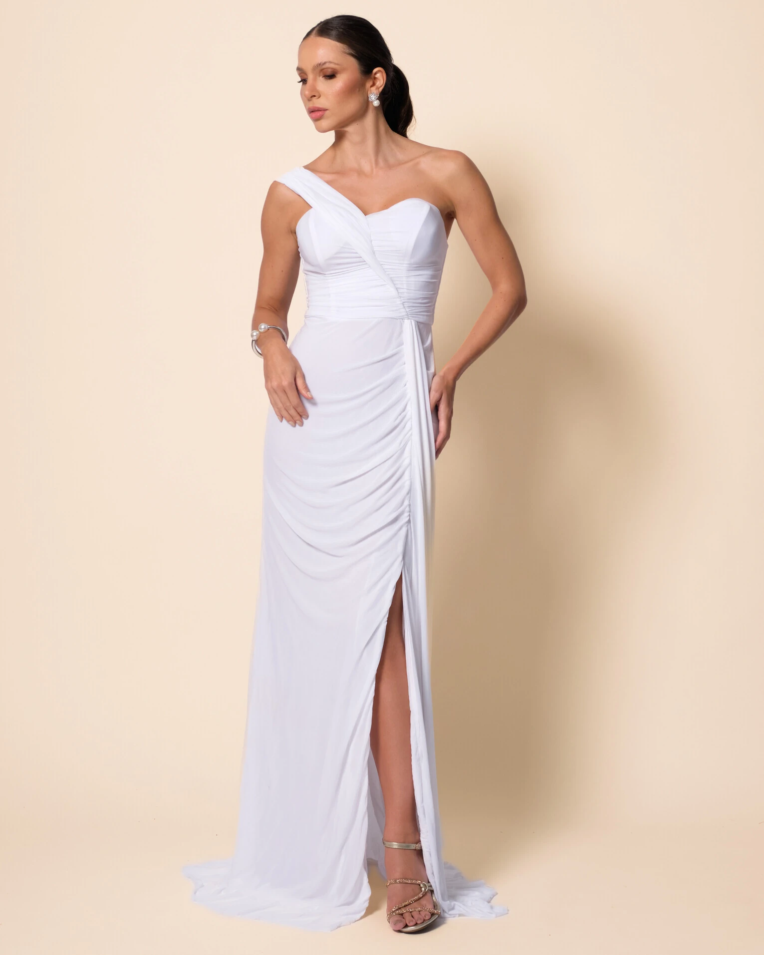 VESTIDO DE FESTA LONGO TULE TOMARA QUE CAIA FAIXA DETALHE DRAPEADO E FENDA - Vestido de festa longo com design elegante e marcante, destacando o decote assimétrico de um ombro só e o drapeado estratégico ao longo do corpo, que valoriza a silhueta com sofisticação e um caimento impecável; a fenda frontal adiciona sensualidade na medida certa, enquanto o detalhe de faixa lateral traz movimento e charme extra à peça. Para complementar, aposte em brincos dourados mais imponentes, pulseiras delicadas e sandálias de tiras finas, criando um visual refinado e equilibrado. Ideal para ocasiões como casamentos, formaturas, eventos de gala ou festas noturnas, esse modelo também se destaca em ambientes elegantes como salões luxuosos, festas ao ar livre ao entardecer ou celebrações à beira-mar com clima sofisticado.