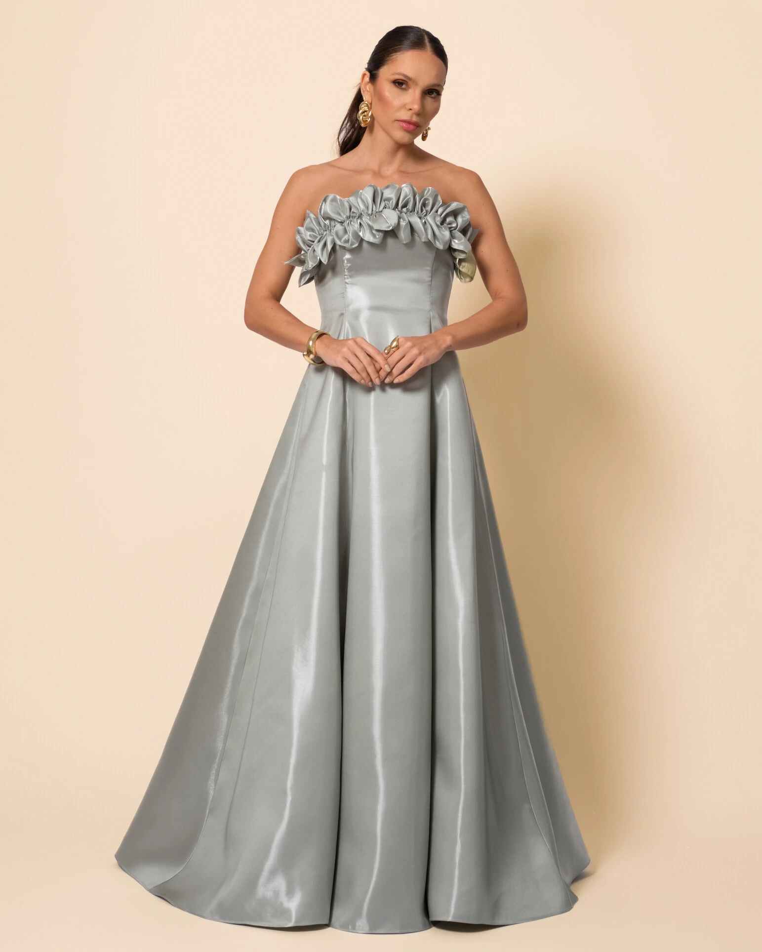 Confeccionado no cetim cristal, o vestido apresenta brilho sofisticado e acabamento acetinado que reflete a luz com elegância, valorizando cada movimento. O modelo possui decote tomara que caia com busto estruturado e aplicação de babados volumosos e delicadamente franzidos na parte superior, criando um efeito romântico e marcante no colo. A cintura é levemente ajustada, destacando a silhueta, enquanto a saia longa em corte evasê se abre com fluidez e caimento impecável, garantindo imponência e leveza ao mesmo tempo.