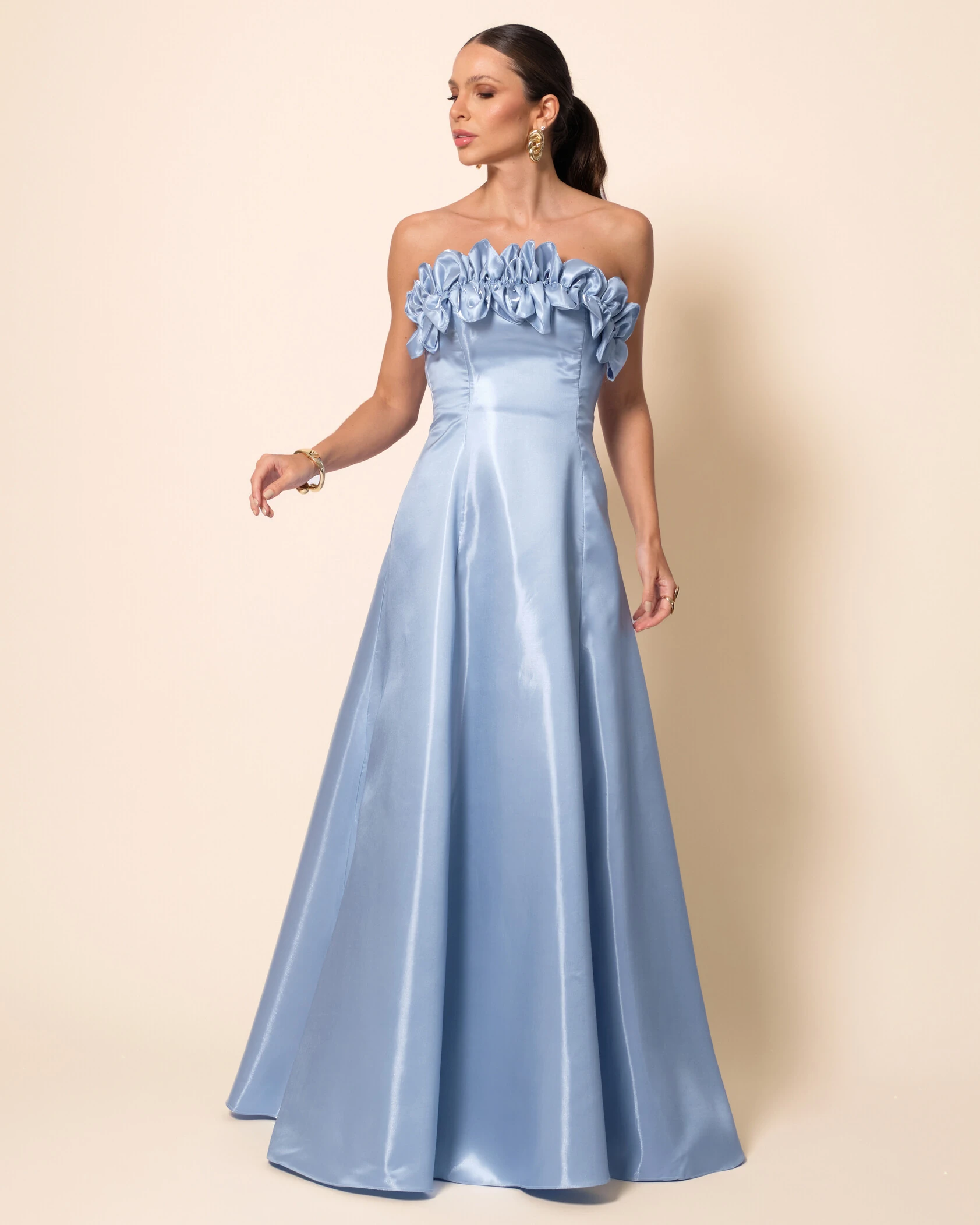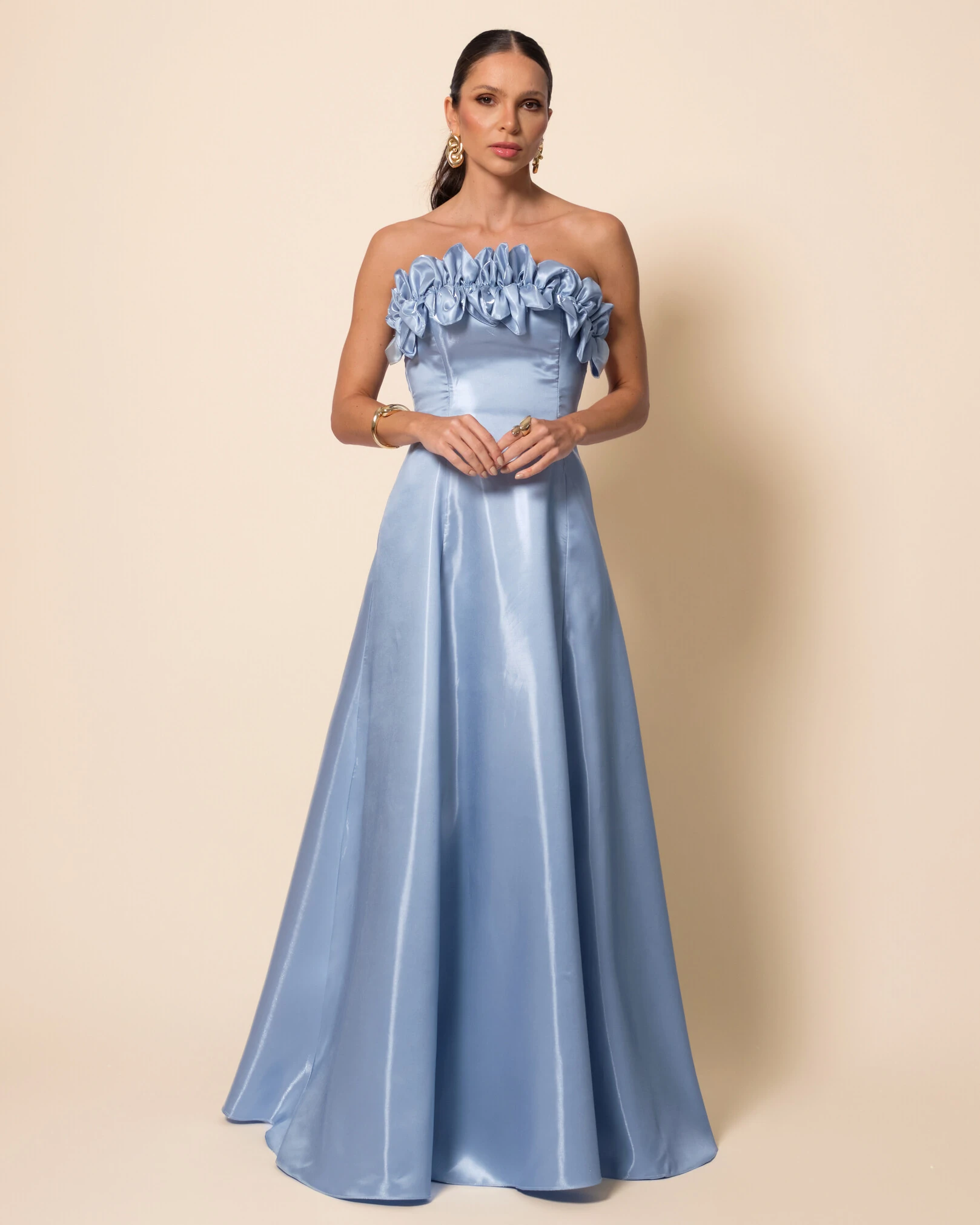 Confeccionado no cetim cristal, o vestido apresenta brilho sofisticado e acabamento acetinado que reflete a luz com elegância, valorizando cada movimento. O modelo possui decote tomara que caia com busto estruturado e aplicação de babados volumosos e delicadamente franzidos na parte superior, criando um efeito romântico e marcante no colo. A cintura é levemente ajustada, destacando a silhueta, enquanto a saia longa em corte evasê se abre com fluidez e caimento impecável, garantindo imponência e leveza ao mesmo tempo.