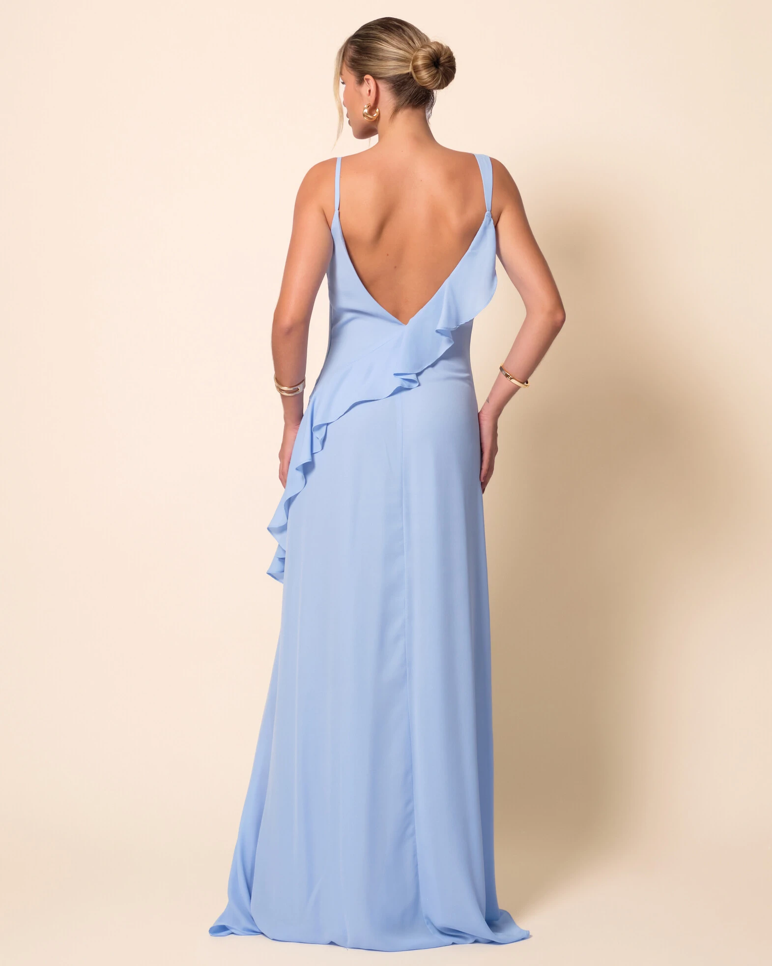 Vestido de Festa Longo Crepe Chiffon Degagê com Fenda e Babado Cascata Serenity