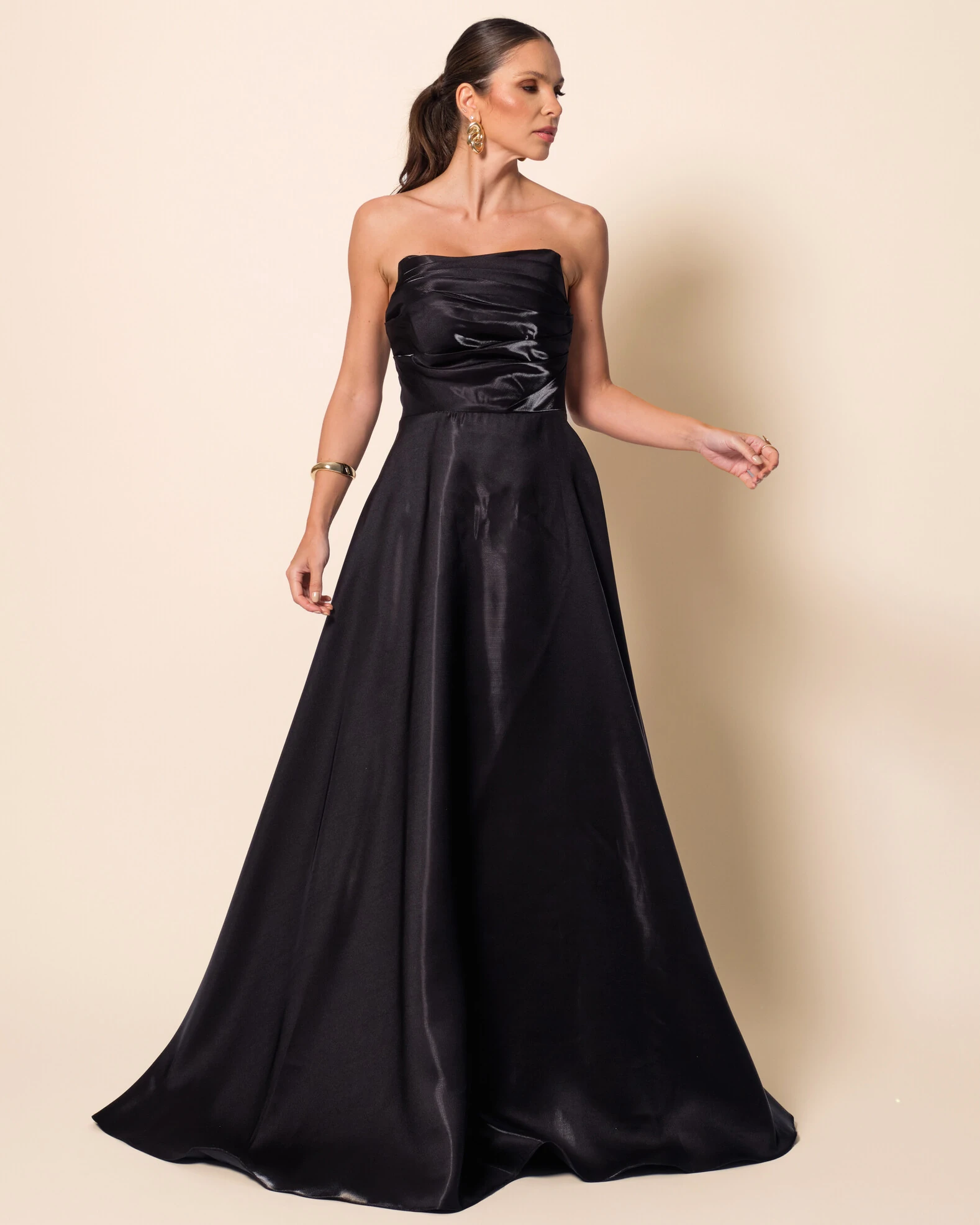Vestido longo confeccionado em zibeline cristal, tecido encorpado com leve brilho sofisticado que proporciona estrutura e caimento impecável, apresentando busto tomara que caia com drapeados horizontais que valorizam o colo, cintura bem marcada que define a silhueta e saia ampla em modelagem evasê com volume elegante; nas costas, o decote é levemente em V com fechamento por zíper invisível, garantindo acabamento refinado e ajuste perfeito ao corpo.