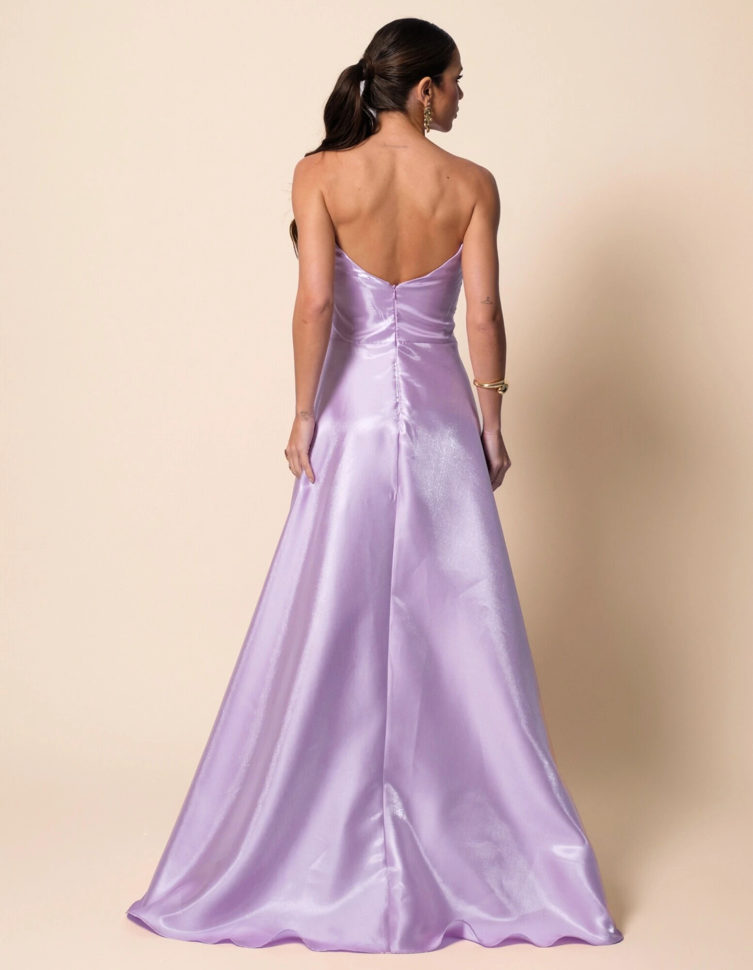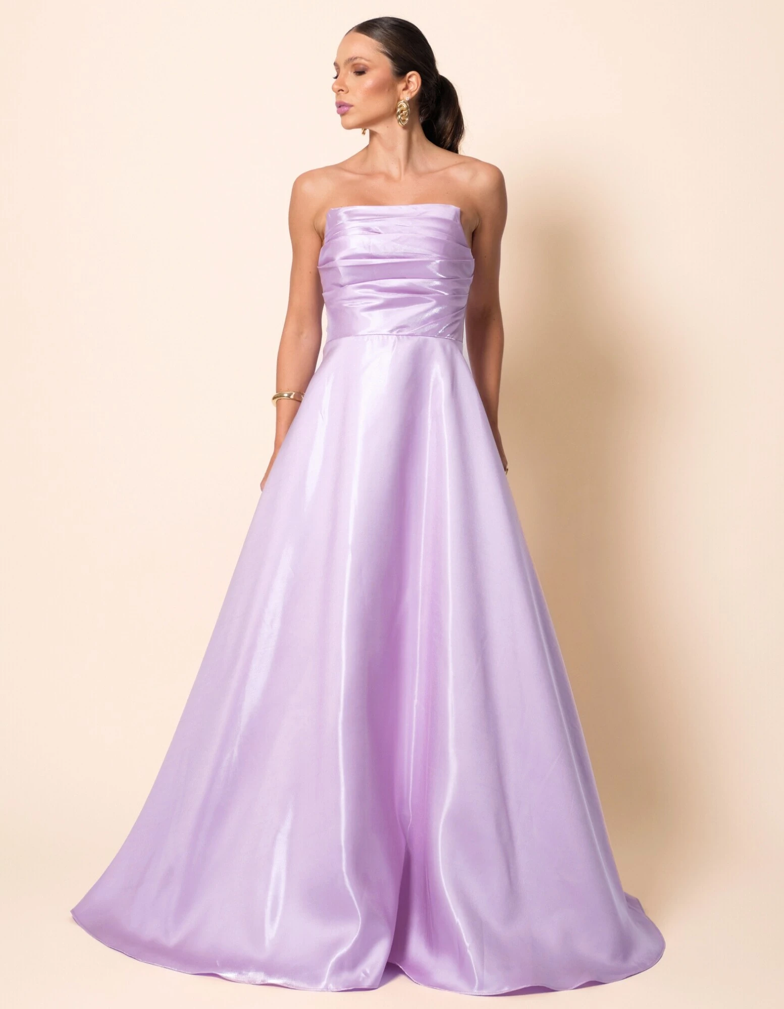Vestido longo confeccionado em zibeline cristal, tecido encorpado com leve brilho sofisticado que proporciona estrutura e caimento impecável, apresentando busto tomara que caia com drapeados horizontais que valorizam o colo, cintura bem marcada que define a silhueta e saia ampla em modelagem evasê com volume elegante; nas costas, o decote é levemente em V com fechamento por zíper invisível, garantindo acabamento refinado e ajuste perfeito ao corpo.
