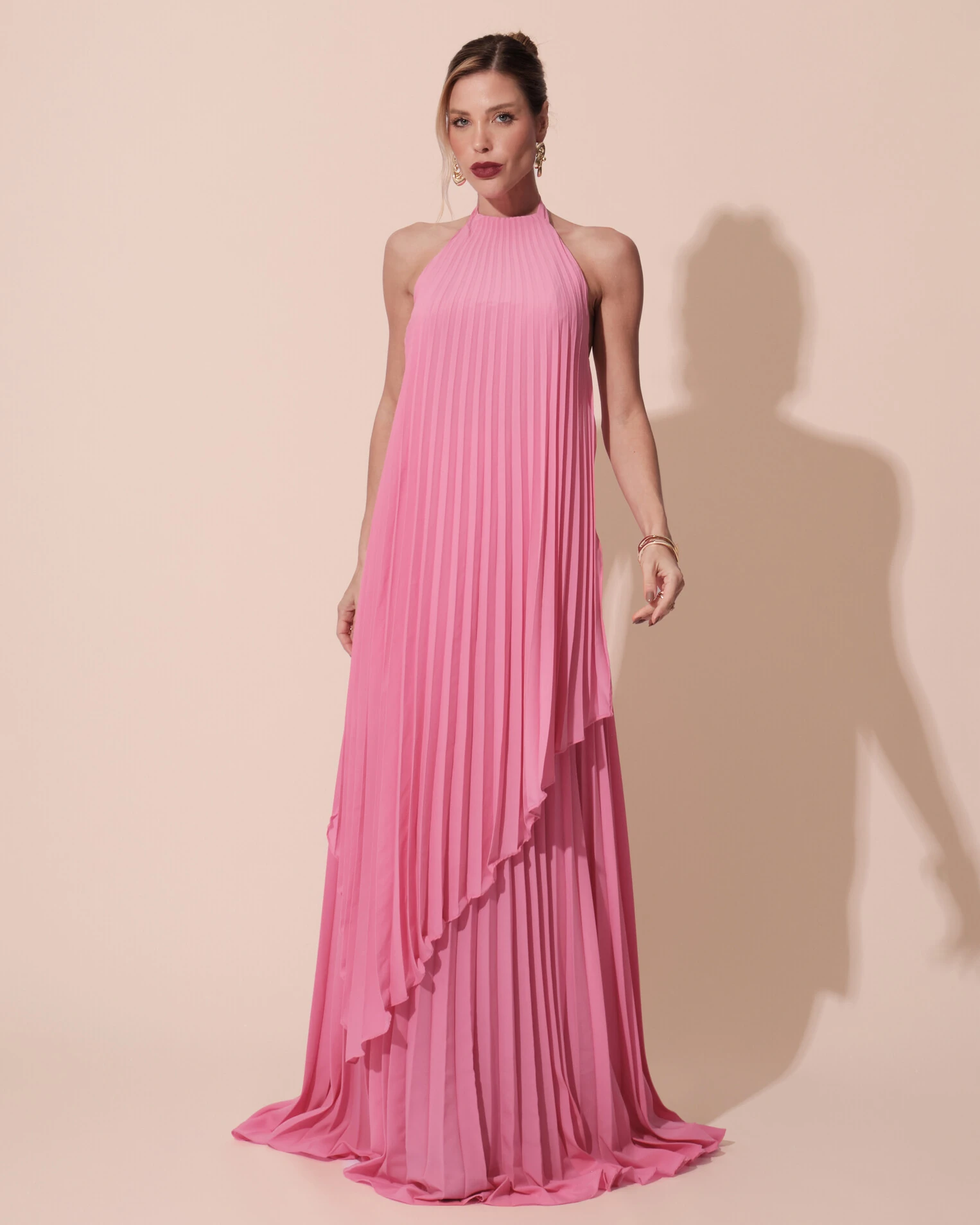 VESTIDO DE FESTA LONGO CHIFFON FLUIDO FRENTE ÚNICA PLISSADO DUPLO - Este vestido longo plissado  é a escolha perfeita para eventos diurnos ao ar livre, como casamentos na praia, festas em jardins ou batizados sofisticados. Com modelagem solta e decote halter, ele traz leveza e movimento, ideal para ocasiões que pedem elegância sem abrir mão do conforto. Para complementar o look, aposte em sandálias de tiras douradas, clutch neutra e brincos statement que iluminem o rosto — uma maquiagem fresh e penteado preso completam a produção com sofisticação.