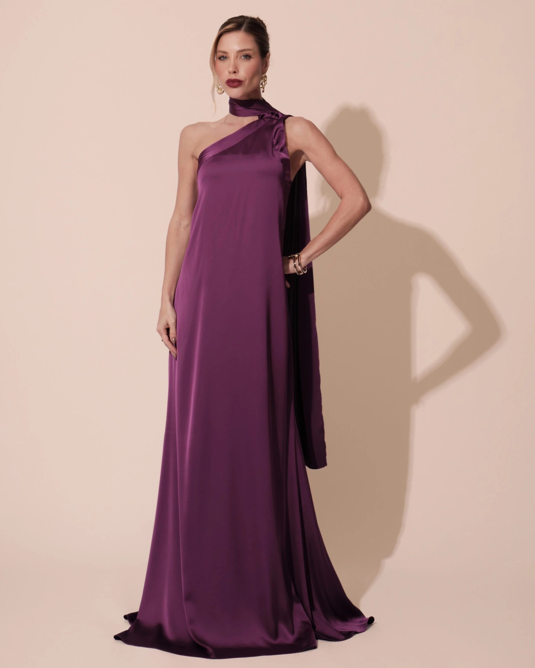 Confeccionado em cetim, o vestido apresenta um caimento leve e acetinado que valoriza o brilho e o movimento do tecido. O design de um ombro só com echarpe integrada cria uma silhueta elegante e moderna, enquanto o corte reto alonga a figura com sofisticação. O toque do cetim confere um ar luxuoso e fluido, perfeito para iluminar produções festivas com delicadeza e presença.