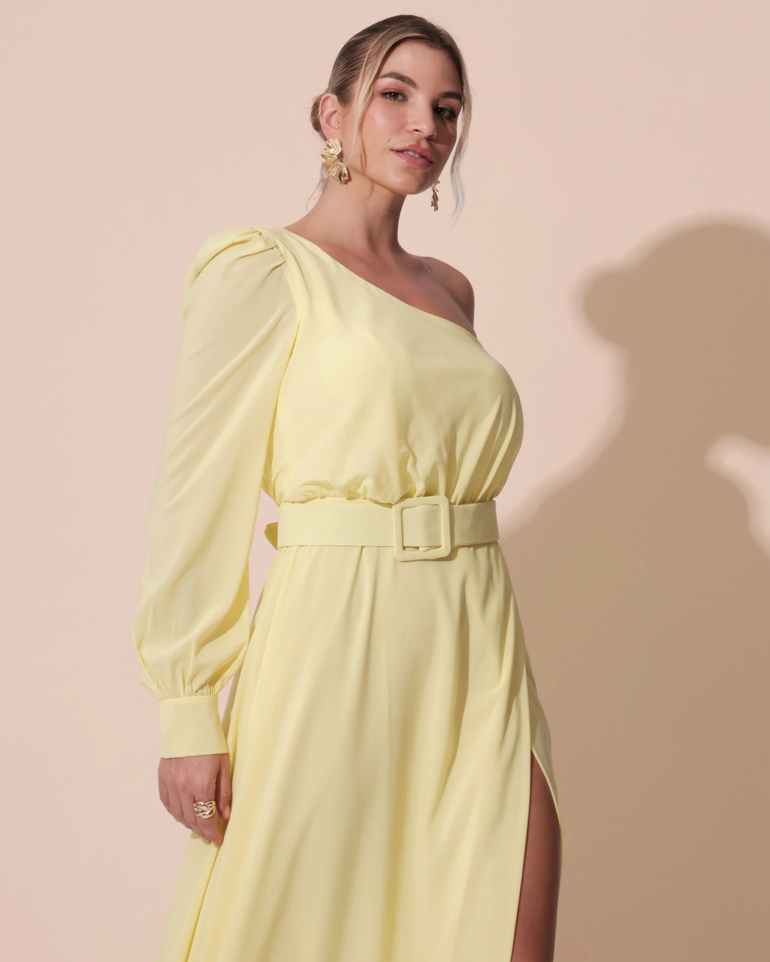 Vestido de Festa Longo um Ombro Só Manga Longa com Cinto Amarelo Manteiga