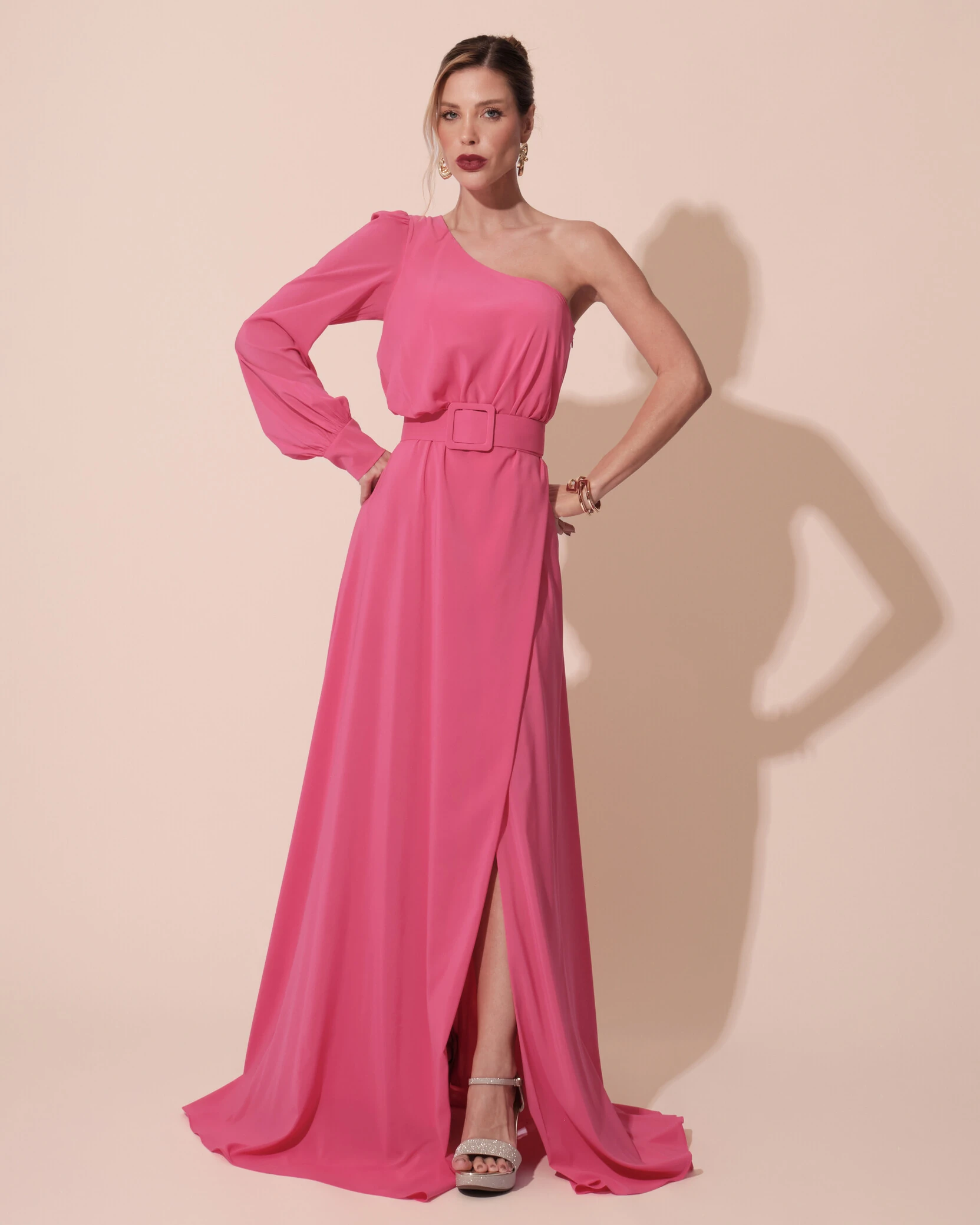 Vestido de Festa Longo um Ombro Só Manga Longa com Cinto Pink New
