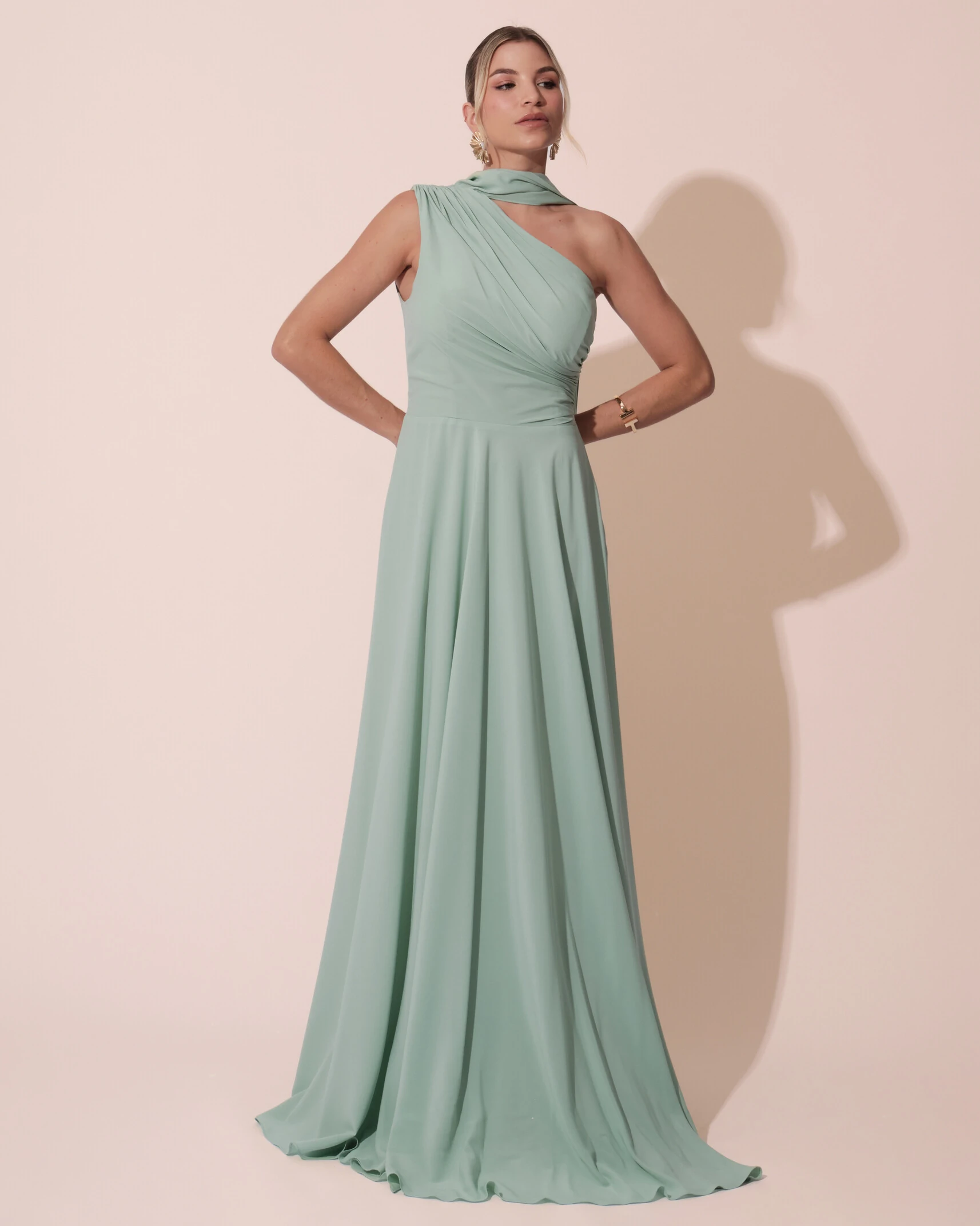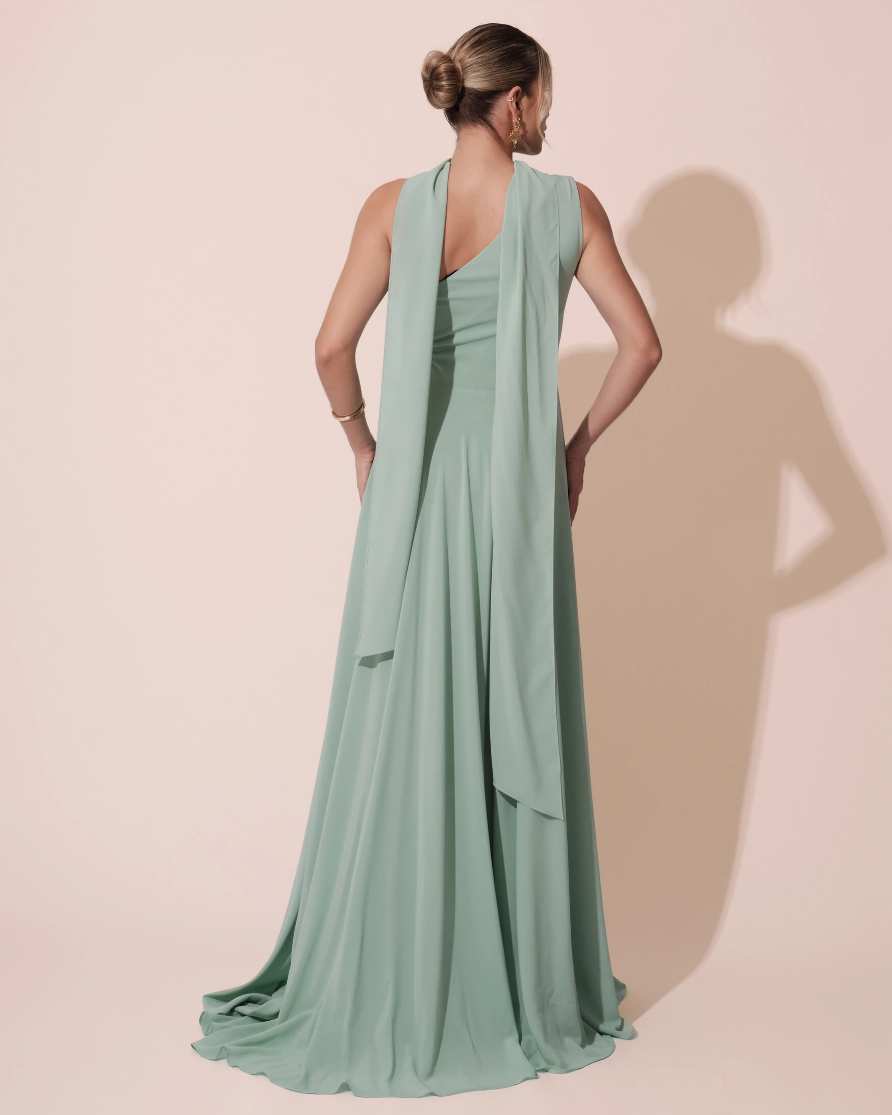 Vestido de Festa Longo Crepe Chiffon Um Ombro Só Drapeado com Lenço Verde Menta
