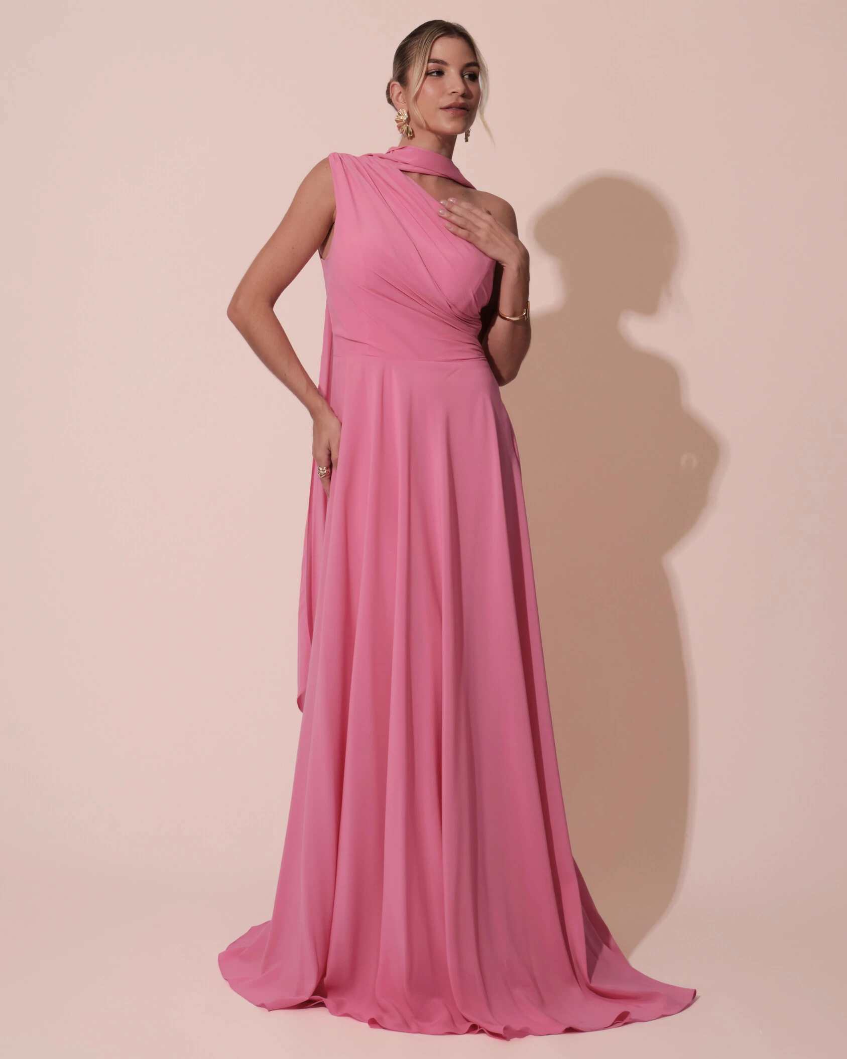 Vestido de Festa Longo Crepe Chiffon Um Ombro Só Drapeado com Lenço Rosa