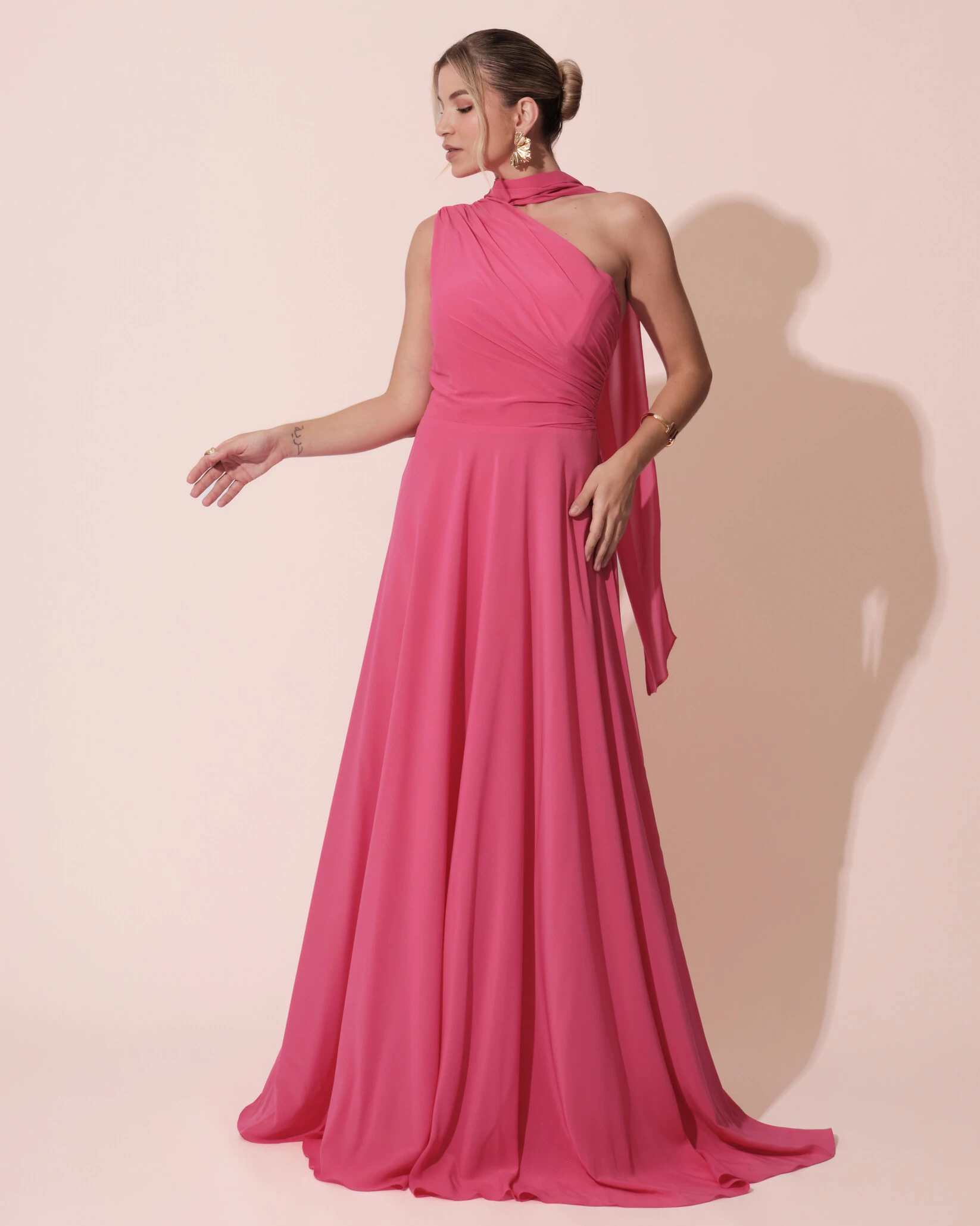 VESTIDO DE FESTA LONGO CREPE CHIFFON UM OMBRO SÓ DRAPEADO COM LENÇO - Esse vestido longo transmite elegância e sofisticação com seu design de um ombro só com lenço, que valoriza o colo de forma moderna e refinada, enquanto o drapeado estratégico no busto realça a silhueta e a saia fluida garante leveza e movimento ao caminhar. Para complementar, aposte em brincos alongados ou pontos de luz sofisticados, pulseira delicada e clutch estruturada; nos pés, sandálias de tiras finas ou salto minimalista deixam o visual ainda mais elegante. É perfeito para casamentos ao ar livre ou noturnos, formaturas, eventos sociais, jantares especiais e até para madrinhas que buscam um look contemporâneo e marcante.