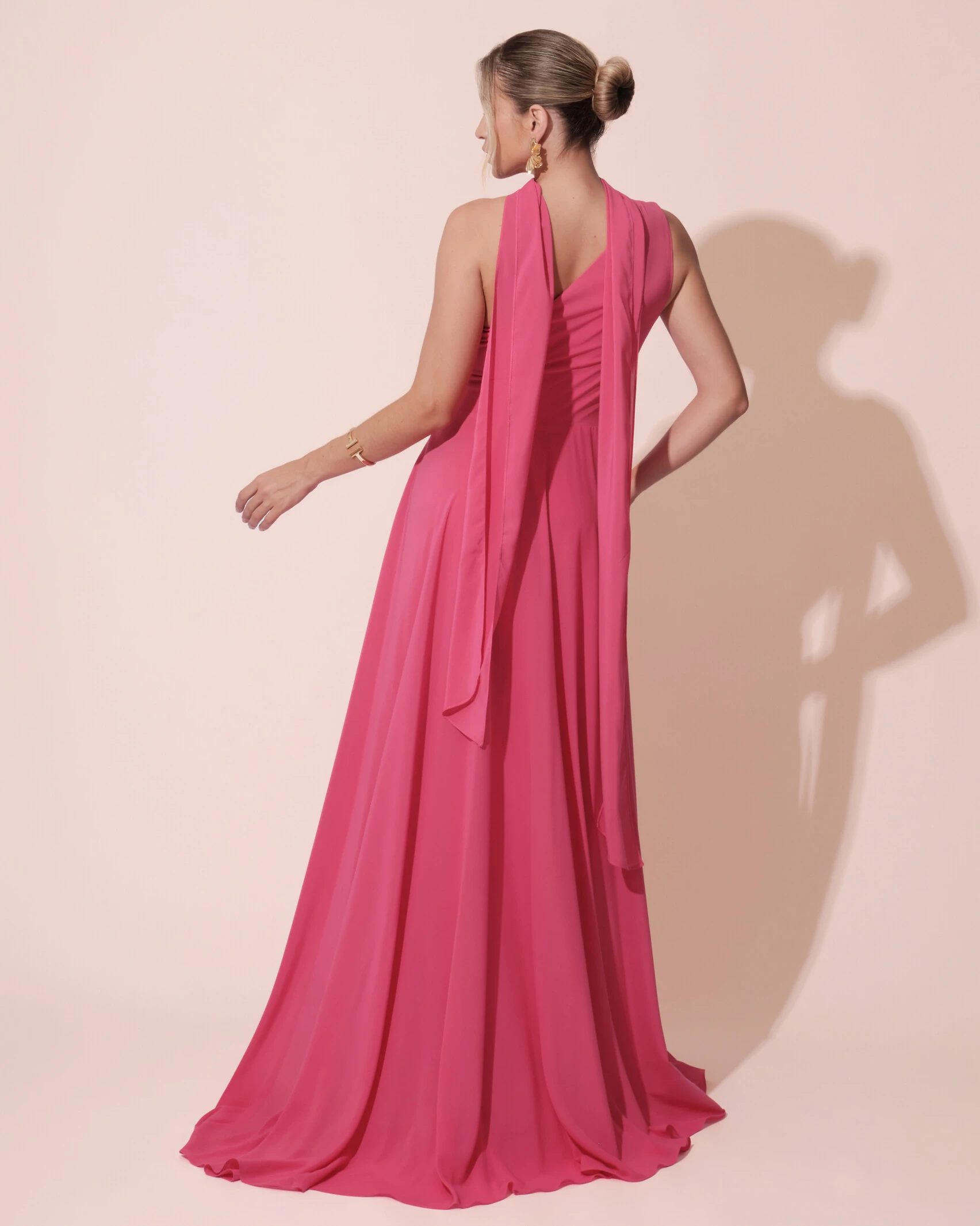 Vestido longo confeccionado em crepe chiffon, com modelagem fluida e caimento leve que garante movimento delicado à saia. Possui decote assimétrico de um ombro só com detalhe em lenço alongado, que pode ser transpassado no pescoço, permitindo diferentes formas de uso e trazendo versatilidade ao modelo. O busto apresenta drapeado estratégico que valoriza a silhueta, enquanto a cintura é levemente marcada para equilibrar a composição. A saia ampla e esvoaçante complementa o design com elegância e leveza, característica marcante do crepe chiffon.
