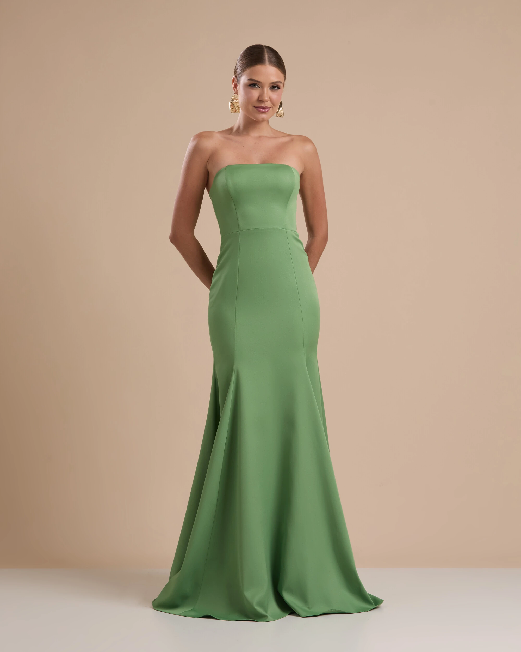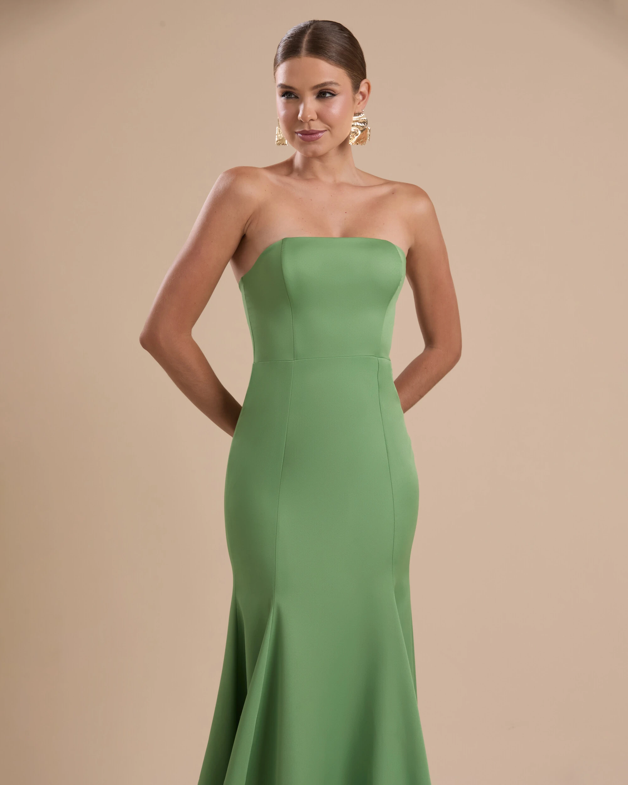 O vestido apresenta uma modelagem tomara que caia de linhas limpas, estruturado em alfaiataria que garante firmeza ao busto e um caimento impecável ao longo do corpo; sua silhueta segue ajustada até a altura do quadril, valorizando as curvas com precisão, e se abre em uma saia fluida de corte sereia que adiciona movimento e elegância, mantendo o visual clássico, sofisticado e de acabamento impecavelmente polido.