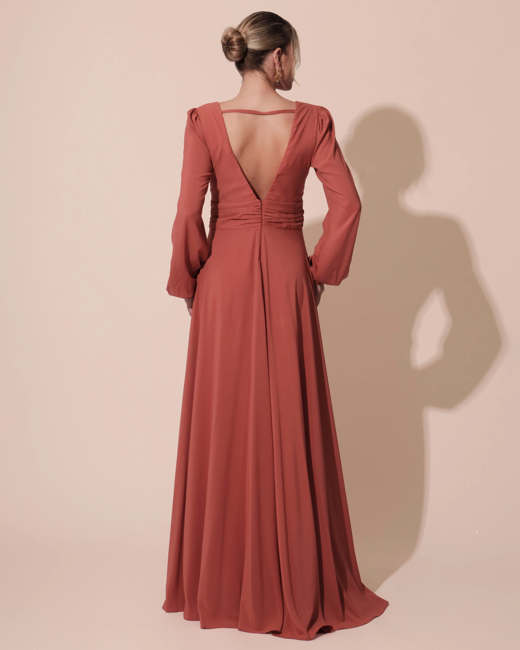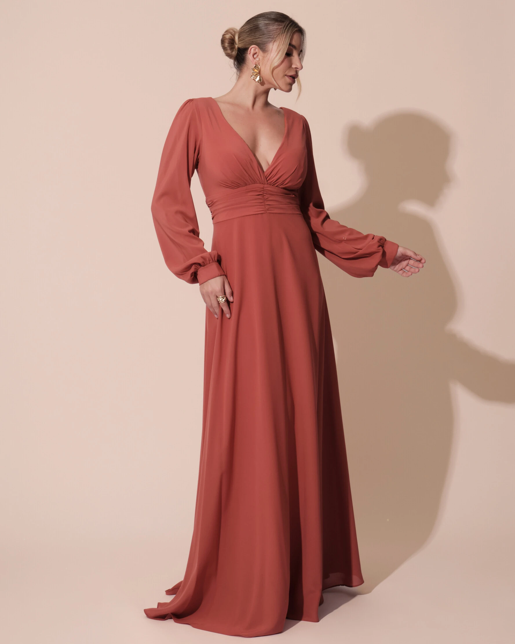 Vestido de Festa Manga Longa com Cintura Drapeada Decote V Terracota