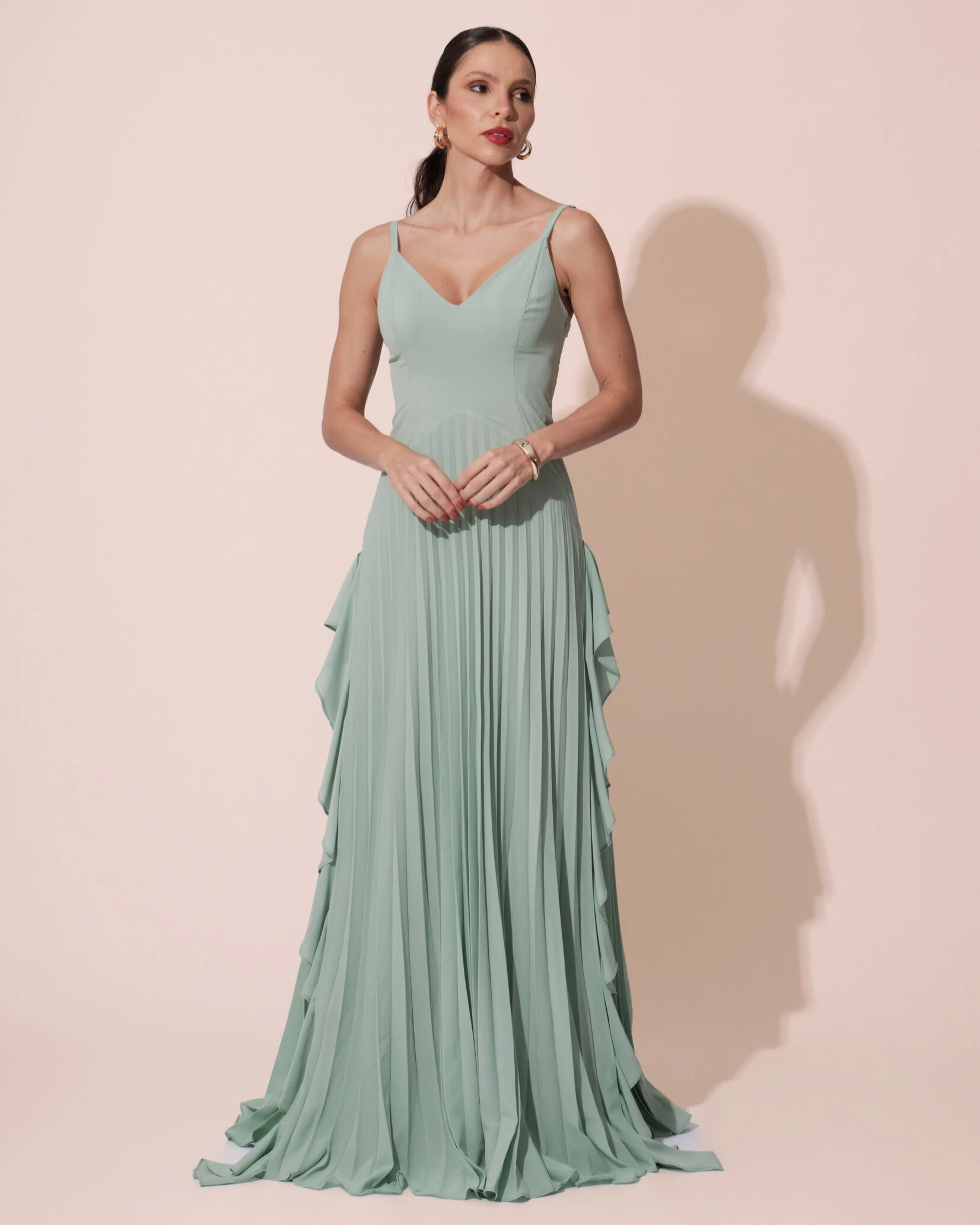 VESTIDO DE FESTA LONGO CREPE CHIFFON ALÇA FINA SAIA PLISSADA COM BABADO CASCATA - Esse vestido longo traz um design elegante e feminino, com alças finas, decote delicado e recortes que valorizam a silhueta, enquanto a saia plissada ganha movimento e sofisticação com babados laterais em cascata que criam um efeito fluido e marcante ao caminhar. Ideal para casamentos ao entardecer, cerimônias ao ar livre, formaturas e eventos sociais mais refinados, ele combina perfeitamente com sandálias de tiras finas, clutch estruturada e brincos alongados ou em pedraria para iluminar o rosto; para um toque ainda mais glamouroso, aposte em um penteado preso ou semi-preso e uma maquiagem com destaque nos olhos, criando uma produção equilibrada e sofisticada.