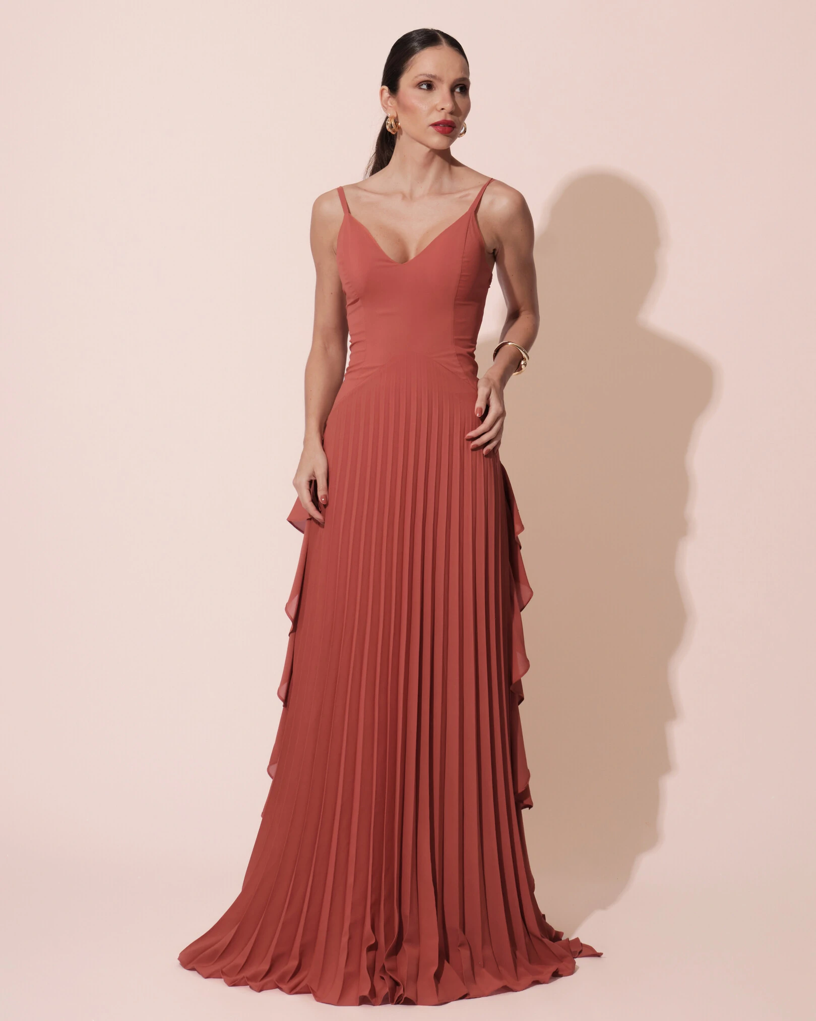 Vestido de Festa Longo Crepe Chiffon Alça Fina Saia Plissada com Babado Cascata Terracota