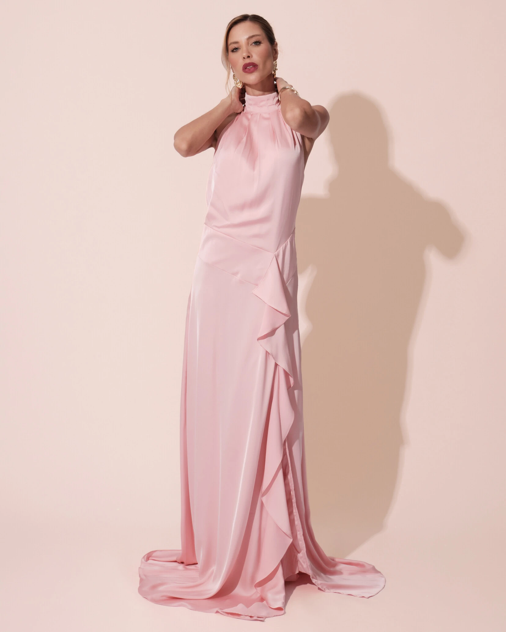 Vestido longo confeccionado em cetim, tecido de brilho acetinado e toque macio que confere sofisticação e leveza ao visual. Possui decote halter com gola alta levemente franzida, criando um efeito elegante e alongando a silhueta. O busto e a cintura apresentam drapeado estratégico que valoriza as curvas com delicadeza, enquanto a saia de modelagem reta garante caimento fluido e impecável. O destaque fica para o babado lateral em cascata, que acrescenta movimento e um acabamento refinado, tornando a peça moderna e impactante.