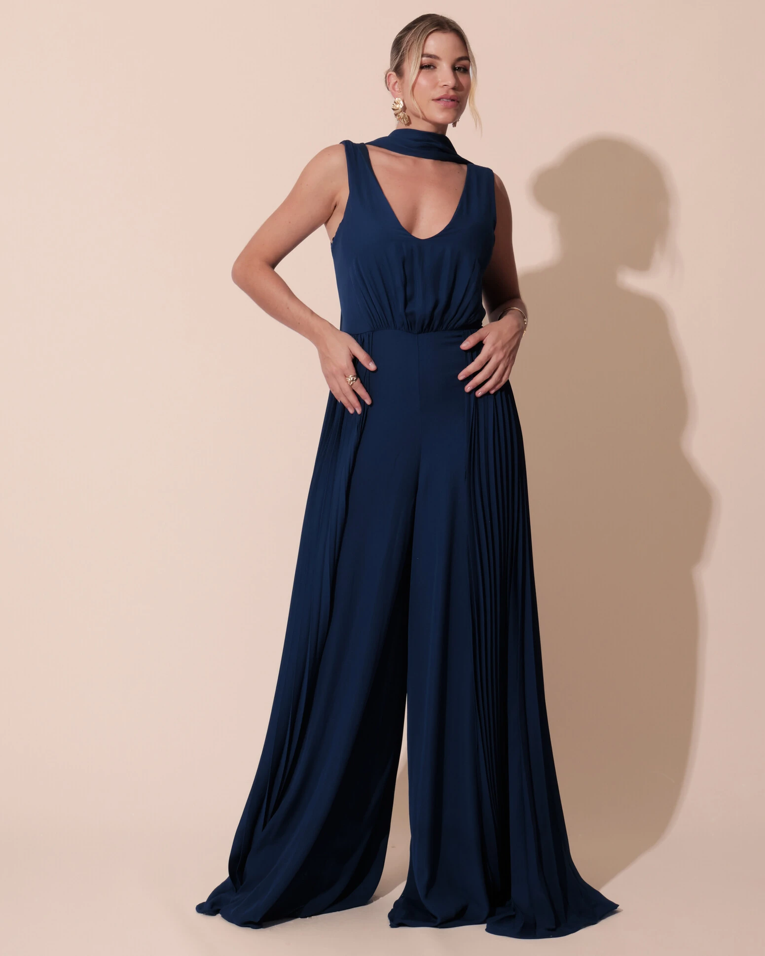 Macacão de Festa Longo Crepe Pantalona Plissado e Lenço Azul Marinho
