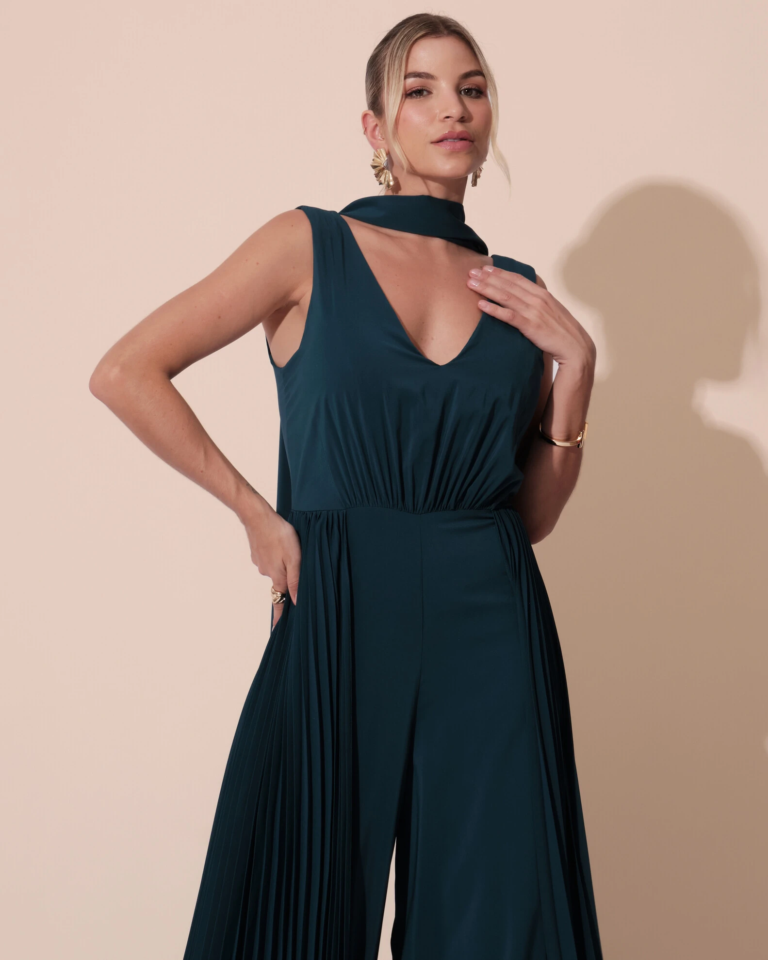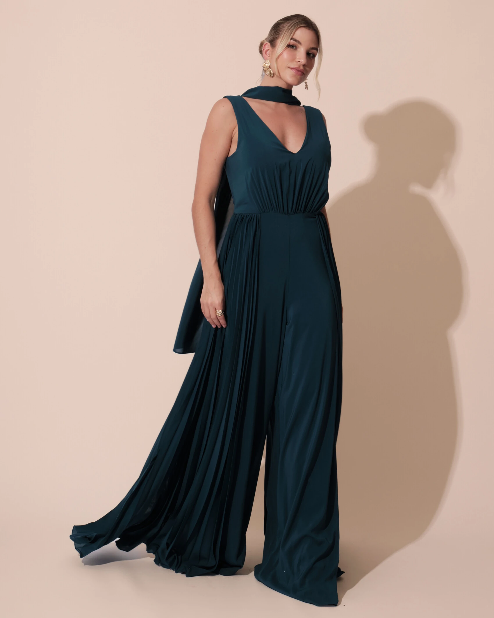 Macacão de Festa Longo Crepe Pantalona Plissado e Lenço Verde Escuro