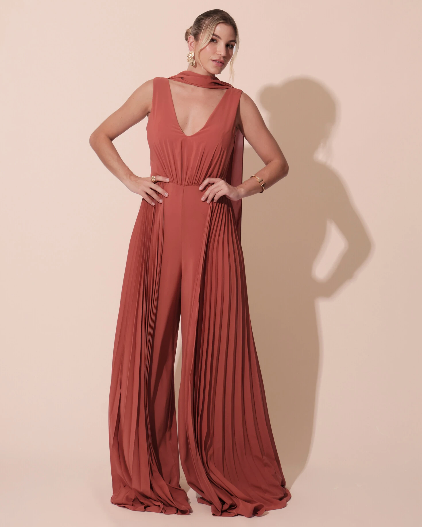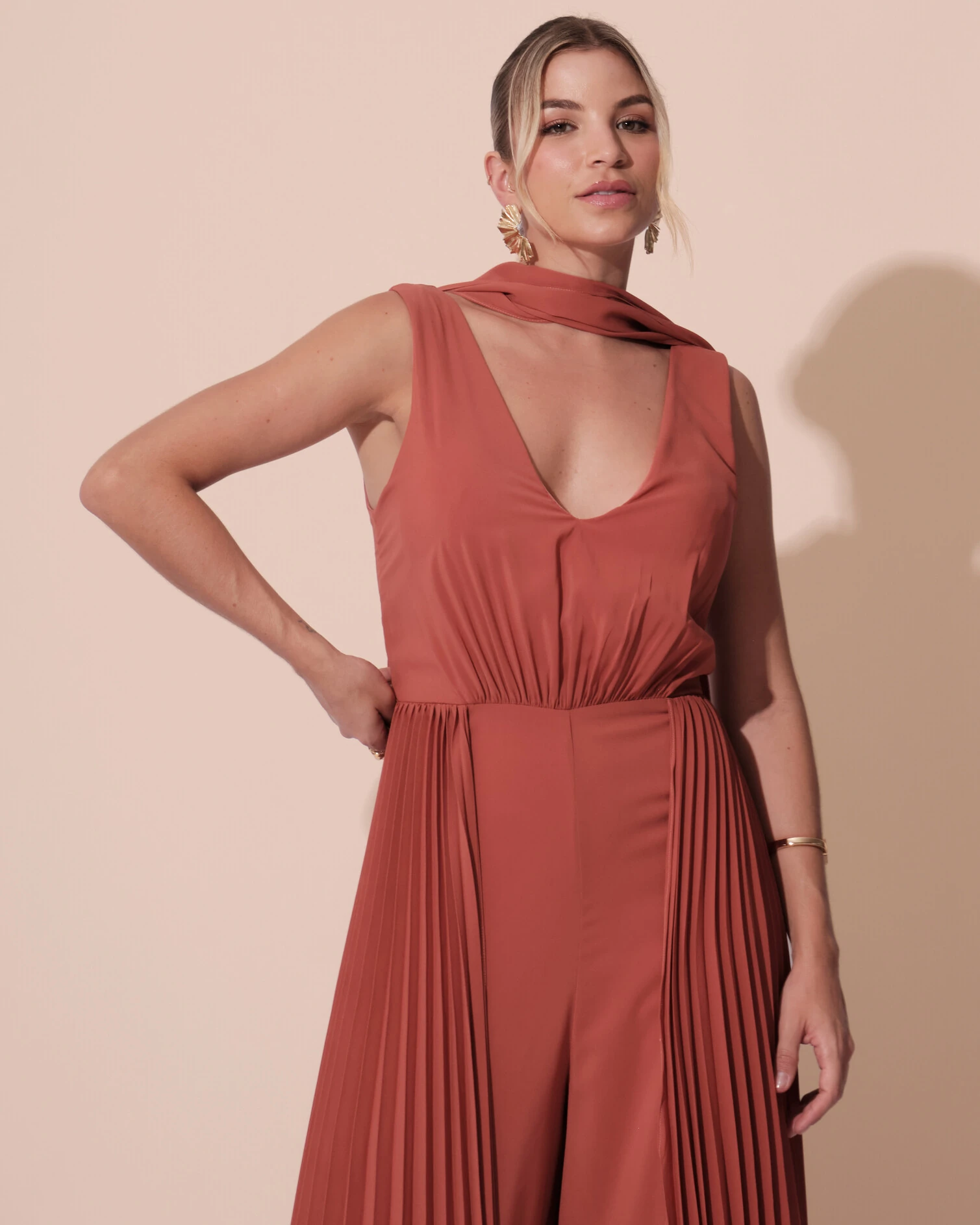 Macacão de Festa Longo Crepe Pantalona Plissado e Lenço Terracota