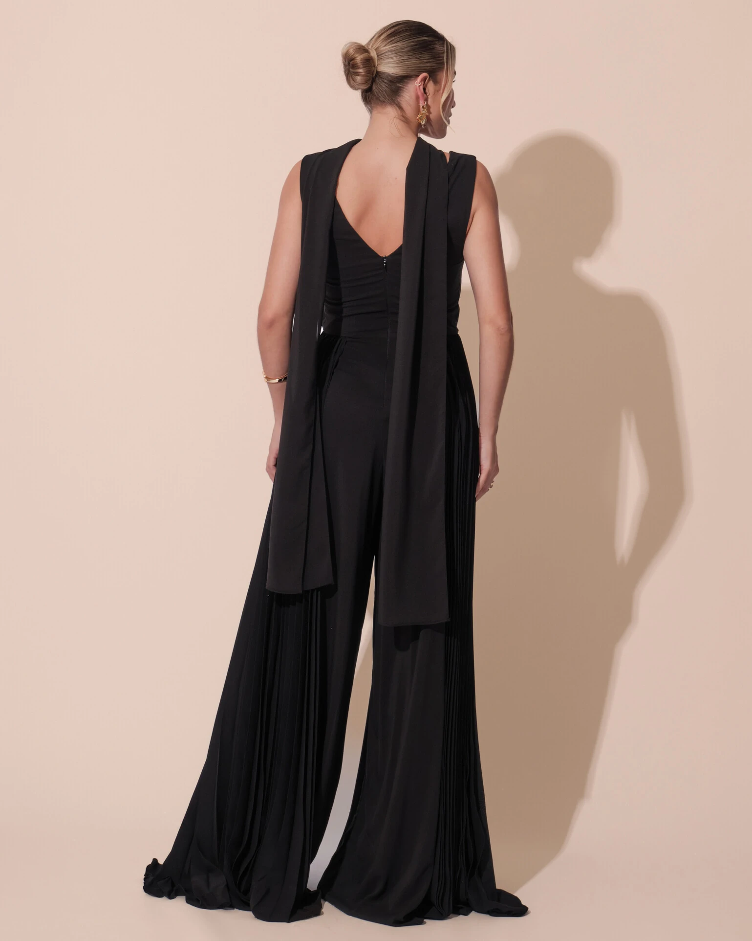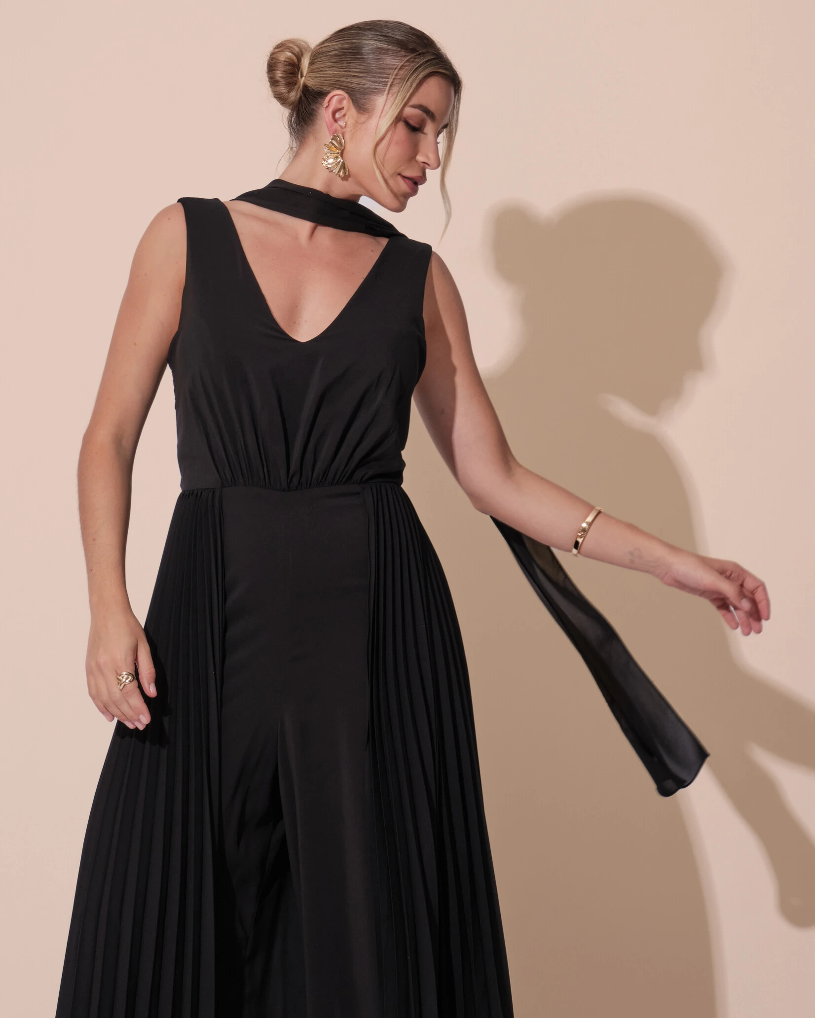 Macacão de Festa Longo Crepe Pantalona Plissado e Lenço Preto